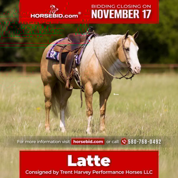 🎲𝓽𝓱𝓮 𝐑𝐈𝐃𝐄𝐑'𝐒 𝓒𝓱𝓸𝓲𝓬𝓮🎲 Happening now thru MONDAY | NOVEMBER 17th - Available EXCLUSIVELY on HorseBid's website! For more details and to register visit: www.Horsebid.com CONSIGNOR CONTACT: Trent Harvey Performance Horses LLC 580-768-0492 LOCATION: Marietta, Oklahoma BREED: American Quarter Horse REGISTERED: Yes REGISTERED NAME: Cheerwine N Sunshine COLOR: Palomino HEIGHT: 15 Hands AGE: 6 GENDER: Mare Latte is a beautiful mare sired by the great Wimpy Chic (NRHA LTE $176,000+) and out of Paparazzi Princess, a daughter of the legendary Princess N Diamonds. With NRHA earnings of over $4,000, Latte has spent the past couple of years taking care of rookie and green riders, all while staying competitive in the open classes—consistently pulling a check nearly every time she enters the show pen. Latte would also excel in the ranch riding events. She’s a stylish, soft mover at all gaits, with a kind disposition and undeniable eye appeal. She’s the type of mare who catches the judges’ attention and can take you straight to the winner’s circle. If showing isn’t your focus, Latte still has plenty to offer. She’s been used to gather cattle and is sure-footed on the trails—crossing creeks, maneuvering through brush, and staying calm and confident wherever she goes. No matter what direction you want to take her—showing, ranch work, or trail riding—Latte will be a great fit. Don’t miss the chance to make her yours; wherever she goes, she’s sure to become part of the family.