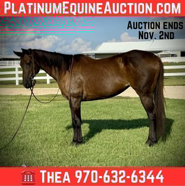 ONLINE AUCTION Place your bids at www.PlatinumEquineAuction.com Starting Bid $3500 Auction ends November 2nd, 2025 Need a new saddle? Check out White Rock Saddles on our website or Facebook I get compliments on this mare everywhere I go! From her easy-going personality to her looks, she is an eye-catcher for sure. This horse does not have a mean bone in her body; she is as sweet and trustworthy as they come. Mary is 15.3h, 6 years old, bombproof on the trail; she does not blink an eye at wildlife, bikes, strollers, bridges, water, semis, lots of traffic, dogs, etc. She will cross, go over, or go through anything you ask of her. Mary is very sure-footed as well and makes an impressive mountain horse. She is great with steep or rough terrain and can pack in and out a lot of weight with how stocky she is. Mary is a great babysitter for teaching young kids how to ride, all ages, all experience levels—she will take care of them. Mary has stunning gaits! She is easy to move off your leg and is also voice-trained; she has a nice easy stop and knows how to stand when you ask. Mary has had a rope thrown off her, messed around with kids vaulting practice, been trail ridden extensively, taught kids lessons, gone hunting, been at local gymkhanas, been in parades, pushed cows, and anything else you can think of out on the ranch. Mary is easy to catch, great for the farrier and vet, self-loads and backs out, great around farm life and wildlife; she loves baths and water and will stand tied all day. She also has a handy neck rein that goes with her. You are sure to like this pretty mare! This mare is a phenomenal horse for so many aspects and disciplines in the horse world and can go just about any direction you’re wanting to go! Come check this phenomenal mare out! Located in Fort Collins, CO. Contact Thea with Dynamite Horses 970-632-6344 for further info. ONLINE AUCTION Place your bids at www.PlatinumEquineAuction.com Starting Bid $3500 Auction ends November 2nd, 2025 Need a new saddle? Check out White Rock Saddles on our website or Facebook