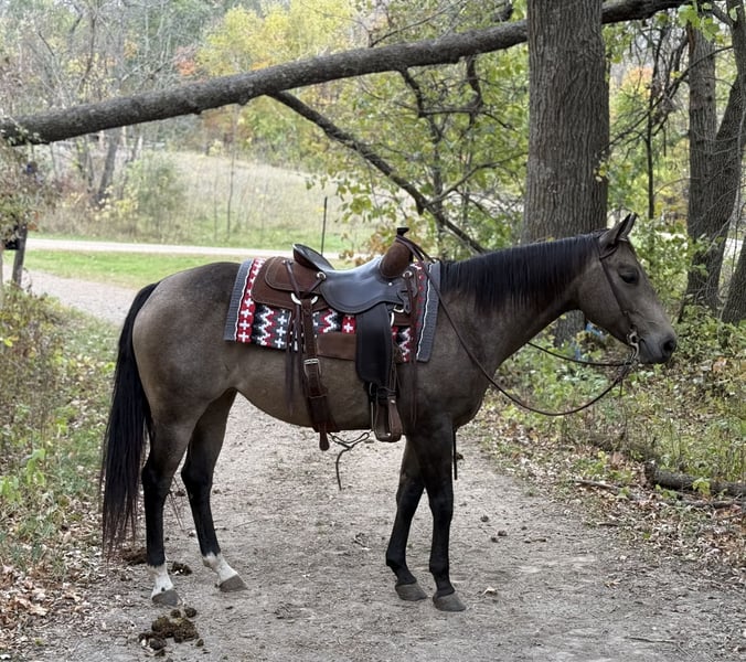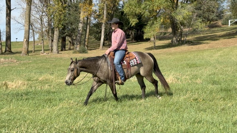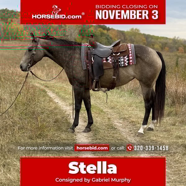 ⚜️𝐓𝐇𝐄 𝐅𝐀𝐋𝐋 𝐇𝐄𝐑𝐈𝐓𝐀𝐆𝐄 𝐂𝐋𝐀𝐒𝐒𝐈𝐂⚜️ Happening now thru MONDAY | NOVEMBER 3rd - Available EXCLUSIVELY on HorseBid's website! For more details and to register visit: www.Horsebid.com CONSIGNOR CONTACT: Gabriel Murphy 320-339-1458 LOCATION: Cannon Falls, MN BREED: Quarter REGISTERED: No COLOR: Buckskin HEIGHT: 14.3 AGE: 6 GENDER: Mare 🌟 Stella – Beautiful 6-Year-Old Buckskin Mare 🌟 Stella is a stunning 6-year-old buckskin mare standing 14.3 hh. She turns heads wherever she goes — whether out on the trail or in the arena — with her big hip, eye-catching dapples, and the perfect size for any rider. This mare is gentle, quiet-minded, and a pleasure to be around. She loves being groomed, stands well for the farrier, and has an easygoing, steady way of going. Stella has been used for all kinds of ranch work: checking fences, doctoring sick cattle, pasture roping, sorting, and loading trucks. She’s also been on overnight camping trips and hauled all over for trail rides — she’s seasoned, solid, and broke the right way. In the arena, Stella has a slow, smooth walk, jog, and lope. She takes both leads with ease, has nice lope departures, and circles up beautifully. She stops off your seat with just a soft “whoa.” She’ll side-pass to open and close gates, go through obstacles, push the ball, and can even be ridden bridleless. Out on the trails, she’s as dependable as they come — she’ll lead, follow, or ride anywhere you point her. She’s traffic-safe, stands tied quietly, loads and unloads with ease, and is fine using a mounting block. Stella is sound, up to date on vet and farrier care, and ready to go in any direction you choose.