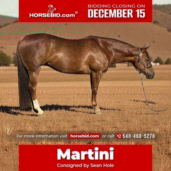 🎄𝐓𝐇𝐄 𝑯𝒐𝒍𝒊𝒅𝒂𝒚 𝐂𝐋𝐀𝐒𝐒𝐈𝐂🎄 Happening now thru MONDAY | DECEMBER 15th - Available EXCLUSIVELY on HorseBid's website! For more details and to register visit: www.Horsebid.com CONSIGNOR CONTACT: Sean Hole 540-460-5278 LOCATION: Staunton, VA BREED: AQHA REGISTERED: Yes REGISTERED NAME: No Sugar Daddy COLOR: Sorrel HEIGHT: 15 AGE: 6 GENDER: Mare 2019 Mare By Walla Walla Whiz This cute mare is ready to take you to the show pen. She has a great brain, quality movement and wants to stop and turn around. Anyone can ride her. She’s good in the pen and on the trails. She’s been hauled to shows. Settles in quickly. Has been shown by a rookie/novice youth. AQHA Point Earner. Martini is the perfect teacher type horse. Simple to ride. Point and shoot. Ready to go in the ranch events. Sound and sane. Five panel negative.