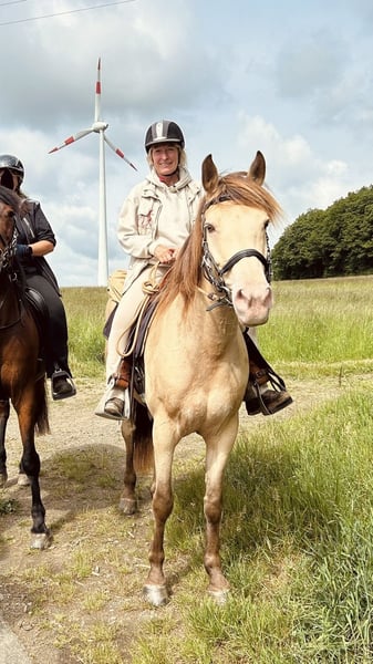 Bildschöne 7-jährige Quarab-Stute mit Papieren Unsere wunderschöne Vanity Girl (genannt Eskana) ist eine außergewöhnlich charmante und ausdrucksstarke Stute, die alle Blicke auf sich zieht – nicht nur wegen ihrer seltenen Farbe, sondern auch durch ihr sensibles, feinfühliges Wesen. Sie ist kerngesund, regelmäßig geimpft und entwurmt, läuft aktuell barhuf und ist absolut schmiede- und verladefromm. Eskana lebt in privater Haltung, wo sie sich auf der Koppel freundlich, sozial und eher rangniedrig zeigt. Sie ist angeritten und besonders gern im Gelände unterwegs. Sie reagiert unterm Sattel noch sensibel auf neue Eindrücke und benötigt kontinuierliches Training, um die Routine weiter auszubauen. Sie kennt bereits Orientierungs- und mehrtägige Wanderritte. Für ambitionierte Freizeitreiter, die Freude an der weiteren Ausbildung eines sensiblen Pferdes haben, bietet sie eine solide Grundlage. Die Entscheidung, sie abzugeben, fällt mir schwer. Dennoch habe ich erkannt, dass wir langfristig nicht optimal zusammenpassen. Eskana ist grundsätzlich sehr brav, ehrlich und leistungswillig, kann aber in unsicheren Momenten oder bei zu viel Spannung auch mal bocken oder kurz losrennen – sie benötigt daher eine erfahrene Reiterin oder einen Reiter, der sie sicher durch solche Situationen führt. Ich wünsche mir für Eskana ein liebevolles, kompetentes Zuhause, in dem sie weiter gefördert und gefordert wird – gerne im ambitionierten Freizeitbereich. Sie wird nur in allerbeste Hände abgegeben. Weitere Informationen gebe ich gerne telefonisch.