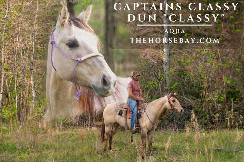 OPEN BIDDING ON THEHORSEBAY,COM. SALE ENDS ON 05/07 More information is available on the website, including an UTD vet inspection, Coggins, video, images, and the owner's contact information to ask questions, request information, or make arrangements to come to visit. CLASSY as we call her, has more class than a school. Gorgeous, American Quarter Horse Mare, Dunskin color, built right, and looks great. Easy keeper and utd on everything. Very personable mare, with 100s of miles of trails behind her and always enjoys going. She has played at the Saddle Club and 4-H Club, been in parades, and completed some mounted patrol training. She will go anywhere you point, through water, and over rough terrain. Traffic safe and non-spooky. Notice her beautiful, unique, tipped ears and tiger-striped legs. Would also make a good color-producing broodmare. You’d be hard pressed to find a prettier more Classy Mare.