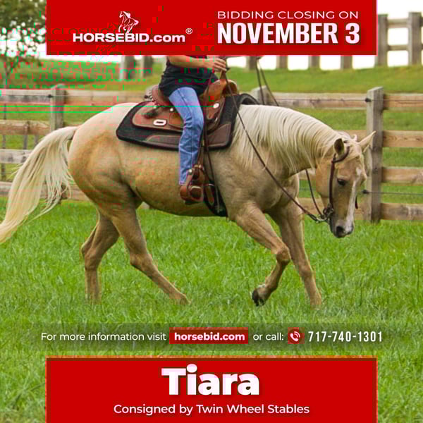 ⚜️𝐓𝐇𝐄 𝐅𝐀𝐋𝐋 𝐇𝐄𝐑𝐈𝐓𝐀𝐆𝐄 𝐂𝐋𝐀𝐒𝐒𝐈𝐂⚜️ Happening now thru MONDAY | NOVEMBER 3rd - Available EXCLUSIVELY on HorseBid's website! For more details and to register visit: www.Horsebid.com CONSIGNOR CONTACT: Twin Wheel Stables 717-740-1301 LOCATION: Gordonville, PA BREED: AQHA REGISTERED: No COLOR: Palomino HEIGHT: 14.2 AGE: 8 GENDER: Mare Tiara is a sweet mare that has been part of our farm family since she was 2 weeks old. Born on 8/01/17 — raised and trained by me personally. She's been my personal horse since I was just a kid, and she truly is one of a kind. Tiara is a well-seasoned trail horse with miles of experience under saddle. She’s confident and steady on the trail, easily handling all types of terrain, including water crossings. Traffic-safe and calm around vehicles, Tia is unfazed by road noise or passing cars. Whether you're riding out alone or in a group, she’s a reliable, sure-footed partner who’s ready to hit the trail with confidence and ease. Under saddle, she’s as honest and willing as they come. No buck. She picks up all gaits, moves off light leg pressure, knows the word “woah,” and will lope around on a loose rein with collection. She side passes both under saddle and on the ground. She knows the “come get me cue” by tapping her side. She’ll also ride around bareback and bridleless. This is a truly special horse with so much to offer. She’s ready to be someone’s next partner, whether you're looking for a trusted trail buddy, a fun arena horse, or just a horse you can enjoy and grow with. Tiara is incredibly kind, sensitive, and genuinely wants to please. She’s got a fun personality, a teachable mind, and adores any kind of attention — whether it's being bathed, groomed, taken for a stroll, or just spending time together. She has excellent ground manners, isn’t pushy at all, and always respects your space. She’ll meet you at the stall door with her ears up, ready to connect. She loads, unloads and trailers with ease. Has liberty training, will lie down with tap cue and sits on the bean bag. UTD on vaccines and deworming Sound and no vices Assistance in arranging shipping anywhere in the States. Contact Sari with any questions 717-740-1301.
