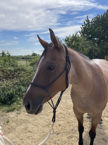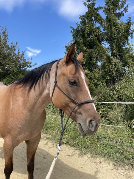 GOTTA BOONBOON DAISY Quarter Horse mare, dun/red roan, 7 years old, born on May 28, 2018 Mare: Smart Spirthly Dunit x Sire: Gotta West Coast Gun Height: approximately 148 cm Panel: 5 N/N negative Regularly dewormed and vaccinated Lodging: currently stabled with a muddy paddock and summer pasture in herd management Farrier- and loading-friendly, currently barefoot Training: Raised and trained by breeder Ariane Lixl until 2.5 years old, 5 months under professional rider Karo Kirchl from about age 3, riding lessons, groundwork course, spook training Due to lack of time after the birth of my child, I have to part with my horse, and I am looking for a lifelong home for her. Daisy has a loving character. She is friendly, fearless, human-oriented, and eager to learn. She is an absolute reliable partner and a calming presence, whether on rides alone or with company, or during training. In training, Daisy always strives to do everything correctly and is motivated during work. She also has a good grasp of things and a clear mind; she usually quickly understands what is expected of her. When riding, Daisy gives the rider a good feeling, not only through her movements. Since she is still young, she needs a confident and experienced riding partner by her side. She is sensitive and refined in handling. When given treats (apple, carrot, etc.), she may start to crib, but she can be easily distracted or diverted with other stimuli. However, with ideal care, feeding, and workload, she shows hardly any tendencies for this. This has been checked by a veterinarian, who found no health issues. Nevertheless, Daisy is a reliable leisure partner with a wonderful character and a true four-legged life insurance. In consultation, some riding equipment (Diamond C saddle, bridle, blanket, etc.) can also be purchased. Location: 3482 Stettenhof, Austria Price: VB 13.🥕🥕🥕 (negotiable) More info gladly via private message!