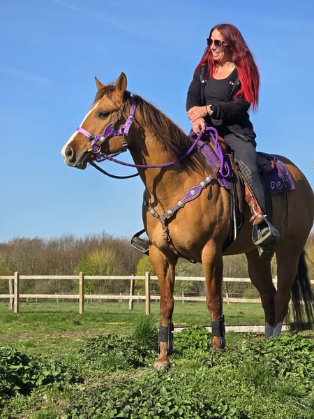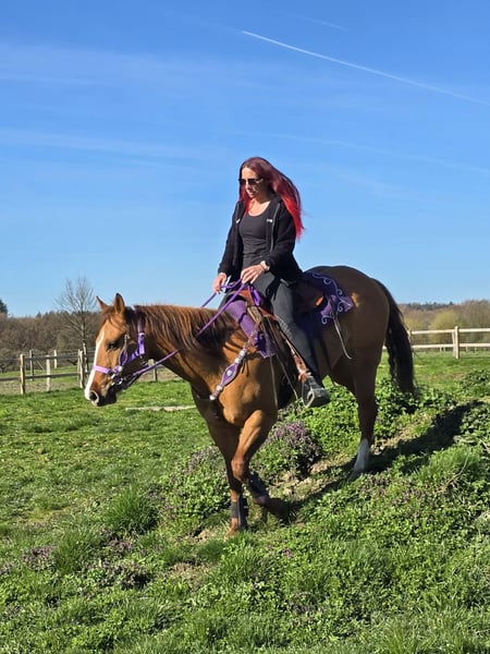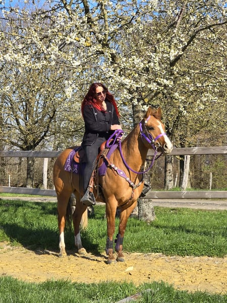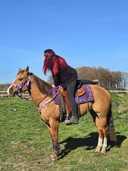 Unter dem Sattel zeigt sie sich zuverlässig und ausgeglichen. Auch im Gelände ist sie eine verlässliche Partnerin und geht brav – sowohl in Gesellschaft als auch alleine. Dabei bleibt sie jederzeit ruhig und gelassen.