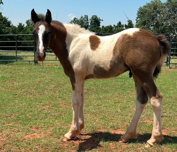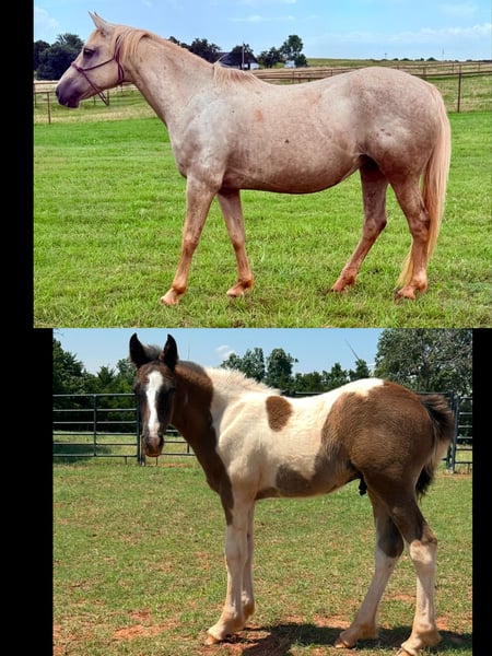 AVAILABLE ON ONLINE HORSE AUCTION AT www DOT MagicHorseAuction DOT com BIDDING OPEN NOW thru TUESDAY | JULY 22nd - BUY IT NOW AVAILABLE! *Final price will be determined on auction site* CONSIGNOR CONTACT INFO: JDT Ranch 572-205-5282 LOCATION: Crescent, OK "Wow! Don’t miss this extraordinary 3 in 1 package opportunity ! meet Athena and her blue roan tobiano gypsy cross stud colt Archer!! ❤️❤️❤️ What a way to upgrade your program right here! Athena is a 8 year old AQHA palomino roan mare. She is just the sweetest girl! And the absolute best mama ! She raises some strapping babies! She has always had happy cross goals in her broodmare career and has produced color every single time! Athena is easy to catch great for the farrier and is up to date on working and vaccines . She is such a joy to have around makes the breeding business a breeze! She has always foaled easily and stays fat even with a foal on her side! Athena is bred back the same way for 2026! Take a look at this stunning BLUE ROAN TOBIANO stud colt Archer . Don’t let his shaggy baby coat fool you he is a true blue roan ! Not only that he is so flashy! Has all the feather bone and hair you could want!!! His full brother stands 15’3 at two years old ! Watch his movement ! It’s absolutely effortless and gorgeous! Will make a high end show prospect! Archer has been exposed to all things on the ranch he will leave the halter broke wormed and vaccinated he really is something to see ! Located in crescent Oklahoma call Megan with Jdt ranch 572-205-5282