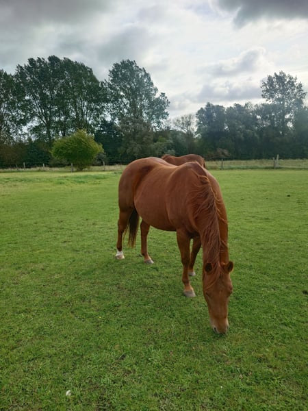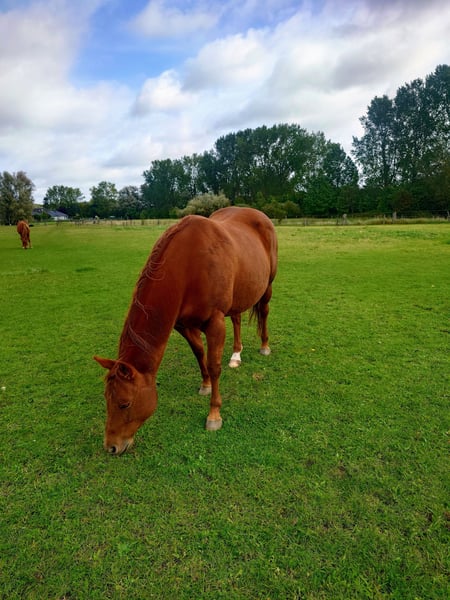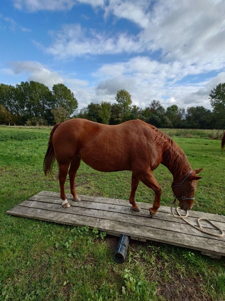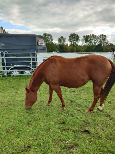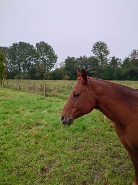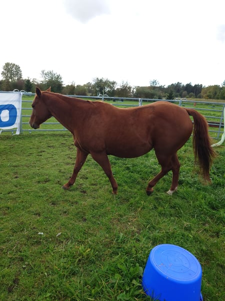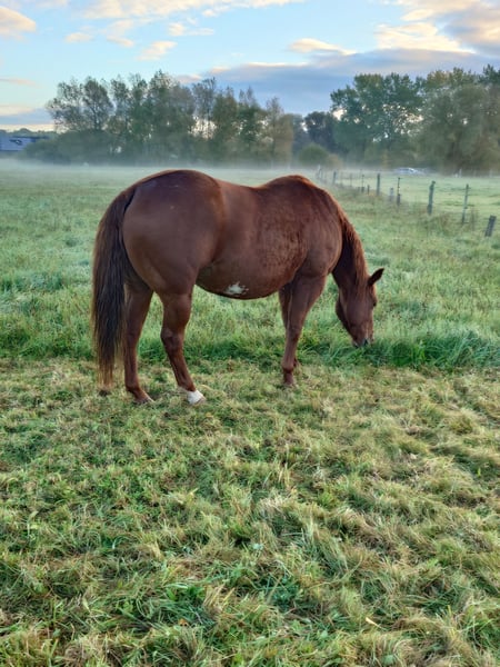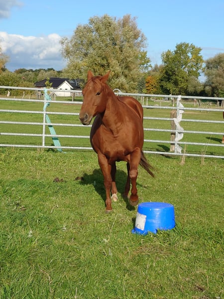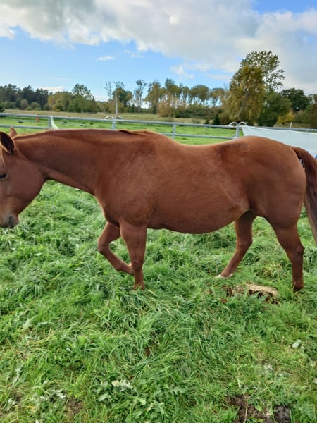 Colonels Rooney, une très jolie jument Quarter, née le 24 mars 2016, est actuellement en pension. En raison du diagnostic de Kissing Spines, elle est proposée à la vente à un prix inférieur, car elle ne peut plus être utilisée comme cheval de randonnée ou pour le travail à la ferme, bien qu’elle ait été jusque-là utilisée pour des sorties en extérieur et du travail avec le bétail. Elle vit au paddock mais connaît également les box (lors de stages). Elle s’intègre bien socialement, étant plutôt de rang inférieur. En daily handling, elle est amicale, curieuse et facile à manipuler. Elle mène très bien en licol et apprend rapidement. Elle est hongre bai, ses dents ont été faites il y a 25 mois, et ses vermifuges, vaccinations ainsi que le maréchal sont à jour. Sa santé est excellente, aucun défaut connu. Notre clinique équine, située à 5 minutes, peut examiner le cheval à tout moment. Elle est fiable lors du travail à la longe et en round pen. Si un renforcement musculaire est souhaité, son équipement peut être repris (la selle, âgée de 2 ans, est adaptée) avec une réduction de prix correspondante. À ses côtés, elle possède également sa pouliche de 2024, bien entendu avec papiers et test de panel, qui peut être achetée avec elle, car nous cessons toute activité d’élevage pour des raisons d’âge. Il ne s’agit pas d’une vente d’urgence ; si je la vends dans deux ans, cela me conviendra aussi.