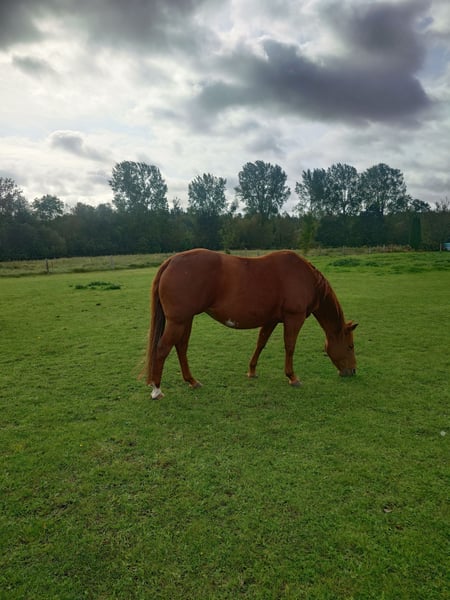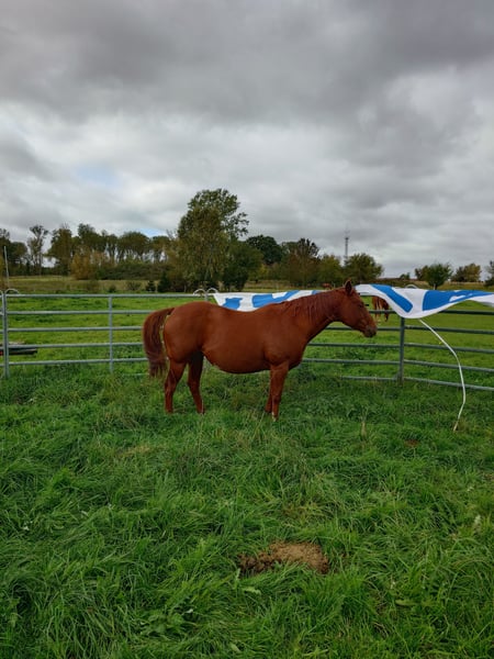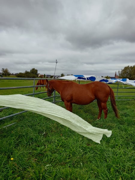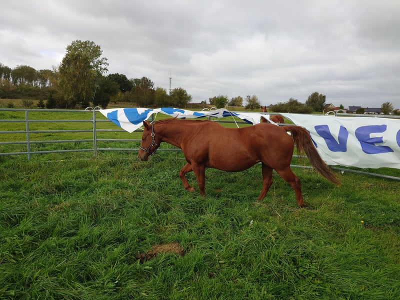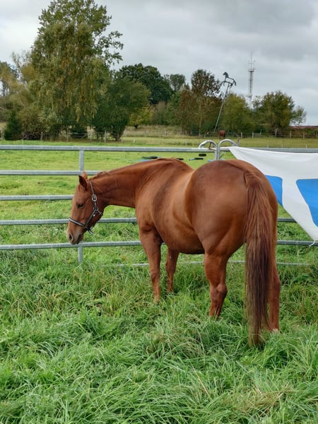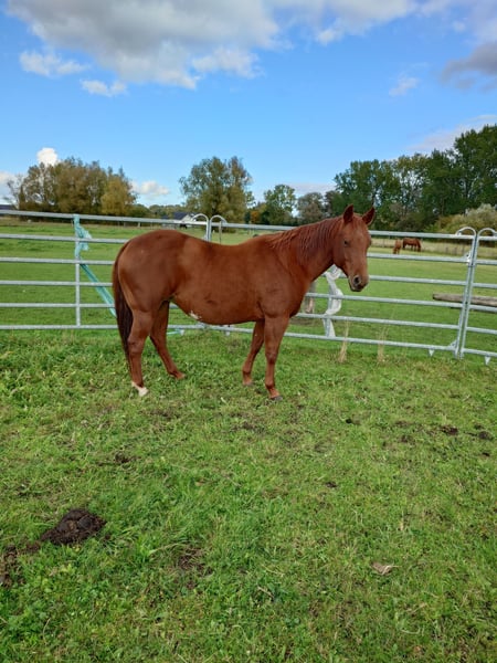 Colonels Rooney sehr hübsche Stute im Quarter tüpp stehend geboren am 24.3.2016 auf Grund der Diagnose Kissing spines wird sie unterm wert verkauft damit nicht als Reitpferd was sie bis her war (Ausritte + Rinder). Sie lebt im Offenstall kennt aber auch Boxen(bei Lehrgängen) sie ordnet sich sozial gut ein ist eher rangniedrig. Im täglichen Umgang ist sie Freundlich und aufgeschlossen gut Halfter führig sie lernt sehr schnell. Sie ist Barhufer, Zähne sind 25 gemacht Wurmkur und Impfungen sowie Hufschmied sind selbst verständlich. Gesundheitlich weiterhin sind keine Mängel bekannt unsere Pferdeklink ist 5Minuten entfernt dort kann alles eingesehen werden. Sie ist bei der Bodenarbeit und im Roundpen unauffällig. Wenn Muskel aufbauen gemacht werden sollte kann ihr Equipment mit übernommen werden (Sattel ist 2 Jahre alt und angepasst) mit entsprechenden Preis Nachlass. Zur Seite hat sie noch ihr Stutfohlen aus 2024 natürlich mit Papieren und Panel Test was mit erworben werden kann dar wir die Pferde Haltung aus Altersgründen komplett aufgeben. Dies ist kein Notverkauf wenn ich in 2 Jahren Verkaufe ist es auch gut.