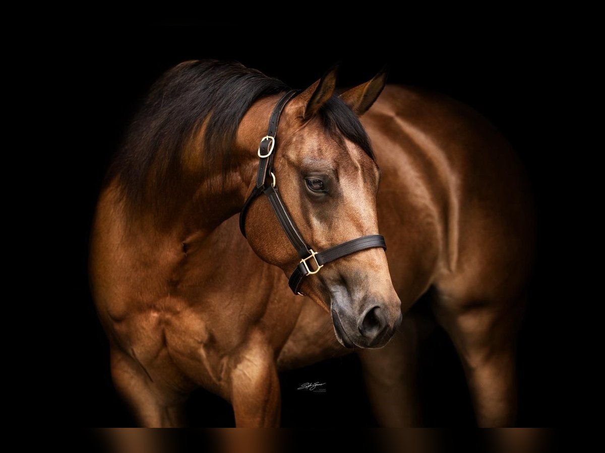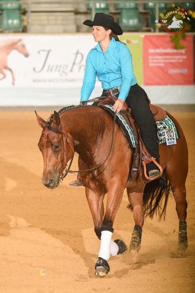 Shiny is a 9-year-old Quarter Horse mare that impresses with her pleasant rideability, honest nature, and versatile training. She has been solidly trained in reining and qualified for the EWU German Open (Young Horse Reining & Basic) at age four, finishing 11th in the Basic. Today, she possesses a good foundation in training and is familiar with reining maneuvers, as well as trail riding, terrain, and cattle work. Thanks to her beautiful movement and her expressive, ground-covering trot, she is also likely to be suitable for ranch disciplines. She can be ridden confidently both alone and in groups in the terrain, and is very reliable. Shiny is also a real treasure from the ground; she is accustomed to herd life but also stands well alone. Loading, farrier visits, and veterinarian care are no problem for her. Her health is regularly maintained through vaccinations, deworming, dental care, and osteopathic treatment. She has tested N/N on the 6-panel genetic test. Shiny is also interesting for breeding – in 2023, she successfully foaled a foal via embryo transfer (artificial insemination). A picture of her foal from 2023 can be seen in the third photo. For more information and a video, please feel free to send a message to +49 151 70117054.