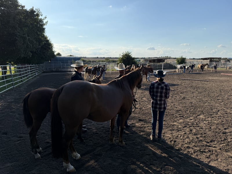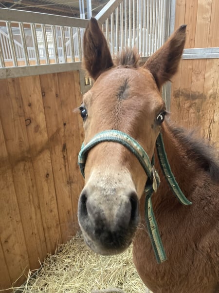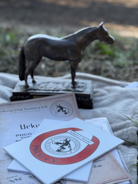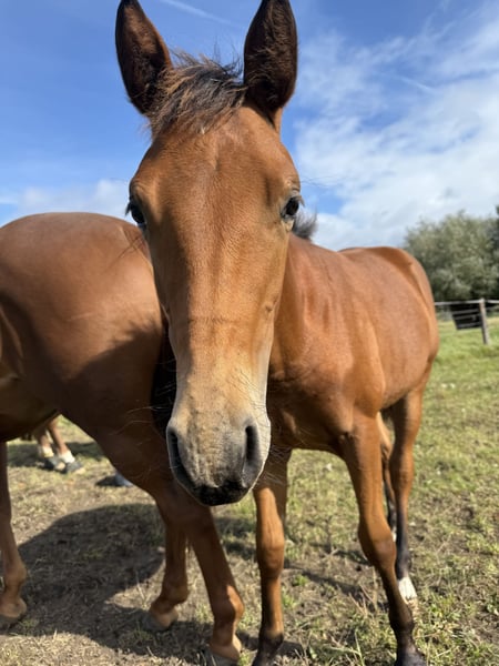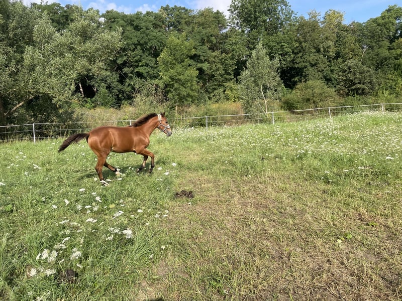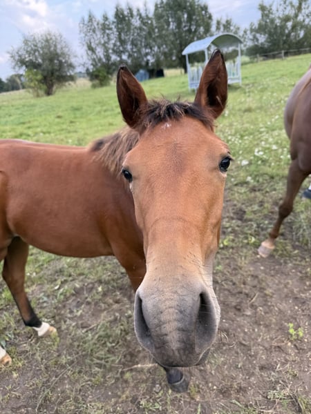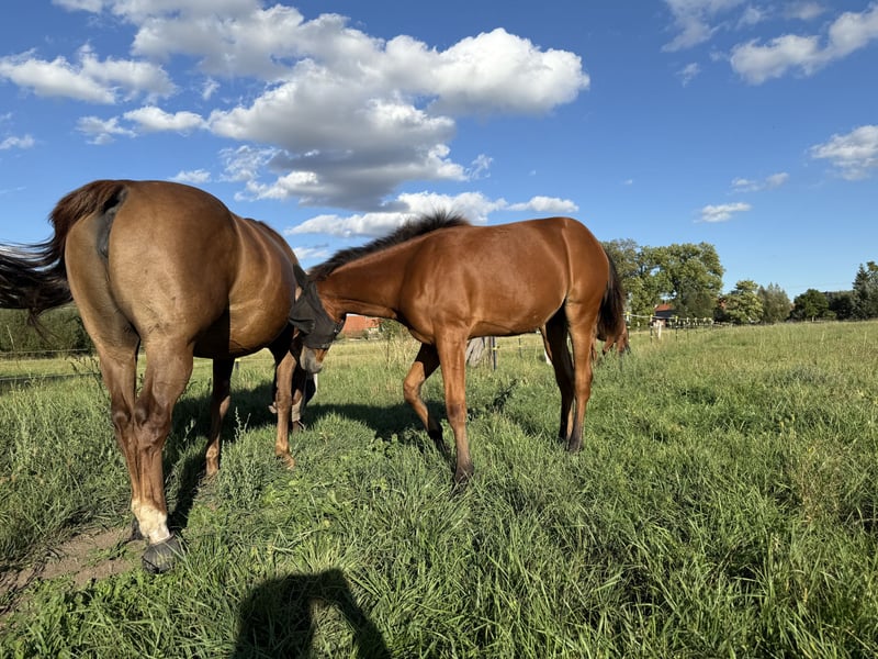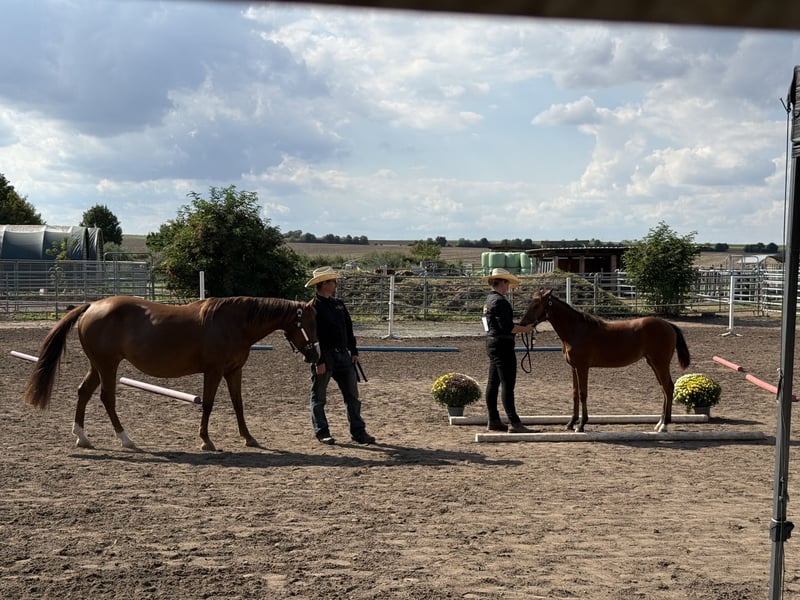 Am 11.03.2025 wurde Margie geboren. Margie ist ein American Quarter Horse Stutfohlen in Bay, doppelt registriert Sir: GUNSPARKS (Gunners Crome Sun) Dam: LDR DUNIT IN THE GUN (Guns of Enterprise) Stutbuch I Prämienstute Teilnehmer Bundesstutenchampionat Sie korrekt gebautes, zeigt athletischen Bewegungen und ist Reining + Allround gezogen. Sie wächst in einer liebevollen Hobbyzucht im Herdenverband auf, kennt bei Abgabe Hunde, Traktoren, Schmied, Tierarzt und 24 Stunden Koppel. Margie hat partiell blaue Augen. Sie ist 7 Panel N/N getestet. Bei Abgabe besitzt Sie ein DQHA Pass und ein AQHA / APH Papier. - weiterhin sie über Laboklin für Lethal White Overo (LWO) und Splashed White N/N getestet Sie erlernt das Fohlen 1×1 und wird nach dem Absetzen ab Oktober in ein gutes Zuhause abgegeben. Unsere Pferde erhalten hochwertiges Futter was sie bei einer optimalen Versorgung von Sehnen, Gelenken und Knochen unterstützt. Margie ihre Halbschwester steht ebenfalls zur Besichtigung. Margie wurde zur Paint Horse Fohlenschau am 06.09.2025 in Könnern vorgestellt. Hier konnte sie mit ihrem athletischen Gang und perfekt bemuskeltem Body überzeugen und erhielt die Wertnote 8,10. Somit ist sie 1a Prämienfohlen. Sie wurde 2. in der Klasse der Stutfohlen und war 2 bestes Fohlen von 18 der gesamten Fohlenschau. Wir wünschen uns für Margie ein 5- Sterne zu Hause, nach Möglichkeit mit Förderung im Sport. Für näheres sowie Bilder/Videos gern melden, Am besten persönlich vorbeikommen und sie kennenlernen. 015151173110