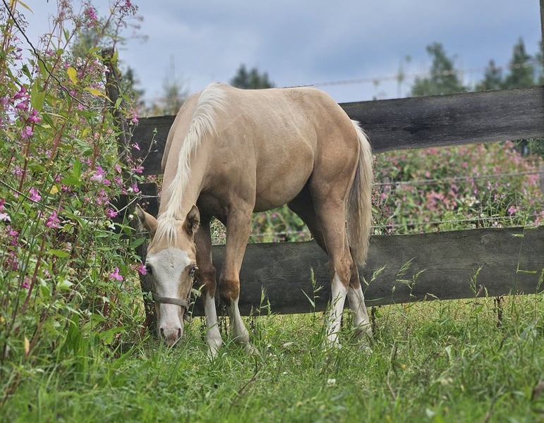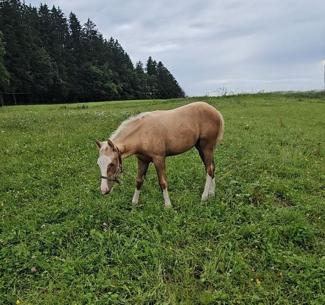 Wanda - ein Traum auf 4 Beinen. Quarter Horse Stutfohlen, 3.25 geboren mit einem geschätzten Endmaß von 152 cm, verzaubert jeden mit ihrem Blick und ihrem Aussehen. Sie hat die wundervolle Farbe Palomino mit interessantem Abzeichen am Kopf. Wanda ist ein sehr gut gelungenes Fohlen, mit korrektem, kräftigem Körperbau und tollen Bewegungen. Das Fohlen ist bisher noch etwas zurückhaltend, taut aber langsam auf und wird neugieriger. Sie ist immer freundlich und brav im Umgang. Später will sie mal Sportler werden und zeigt das durch ein spritziges Verhalten. Das Fohlen wird täglich gehändelt, kennt Hufschmied und Tierarzt und das Fohlen ABC bei Abgabe. Später wird sie sicherlich ein guter Partner in den Reining Klassen werden, aber aufgrund ihrer guten Bewegungen auch interessant für Ranch Riding, Ranch Rail etc.. Wanda`s Abstammung lässt jeden Reining Fan das Herz höher schlagen: Spooks Gotta Gun, Shining Spark, Peponita, Topsail Flashy Jac. Ihr Vater ist der erfolgreich geshowte Spooks Grand Slam (LTE: 150.000 $). Auf Wunsch kann sie zur Aufzucht bleiben.