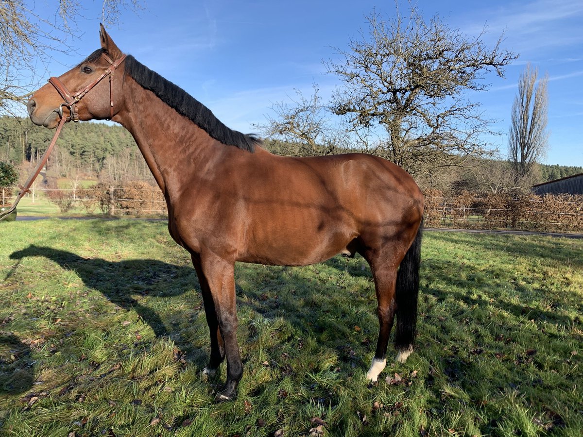 .Der Wallach stellt ein wahres Allrounder-Talent dar. Abstammungsgemäß sowohl mit hochwertigen Dressur- als auch Springgenen ausgestattet. Er bietet im Alter von 9 Jahren drei gute Grundgangarten, tolles Reitgefühl , Zuverlässigkeit im Dressurviereck u. Gelände ,als auch mit sichtbarem Spaß an der täglichen Arbeit. Er stammt ab von Toulon , der abgesehen von seiner Springveranlagung, dafür bekannt ist, seinen tadellosen Charakter zu vererben. Seine Mutter Chinchilla, hat uns mehrere rittige Nachkommen hinterlassen. Es wurden alle „Herzenspferde“. Nachdem er 4-jährig angeritten worden ist, wurde er zunächst bis zu M im Springen u. L in VS ausgebildet wo er auch Erfolge aufweisen kann. Seit Oktober ist er in Dressurberitt und hat gleich bei seinem ersten Start einen 2. Platz in einer A-Dressur belegt. Wir sehen seine Zukunft in der Dressur oder im gehobenen Freizeitbereich. Er ist sehr imposant bei 178cm Stm. , und deckt auch den größeren Reiter ab. Wer darüber hinaus einen absolut treuen, feinfühligen Freund fürs Leben sucht, könnte hier fündig werden. Wir suchen für ihn einen einfühlsamen Reiter, der weiß, was es heißt, ein feinfühliges, liebenswertes Pferd an seiner Seite zu haben. Er sucht die Bindung zum Menschen wie auch zu seinen Artgenossen. Täglichen Koppelgang bzw. (im Winter) Auslauf auf dem Paddock ist unabdingbar. Guter TÜV vorhaben. Er hat hat ein außergewöhnlich korrektes Fundament und war noch nie krank. Demjenigen, der auf der Suche nach den besonderen Pferdepartner für Dressur-Freizeit oder Gelände ist, geben wir gerne weiter telefonisch Auskunft. ( Tel. 01708274330)
