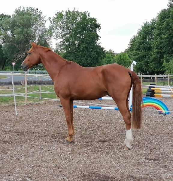 Schweren Herzens verkaufe ich mein geliebtes Springpferd, da ich für ihn einfach nicht die richtige Reiterin bin. Kurze Fakten zu Luigi 289: Zurzeit ist er 4× beschlagen, er ist aber auch schon barhuf M-Springen gegangen. Er ist ein absoluter Liebling im Umgang und besitzt drei tolle Grundgangarten. Außerdem ist er geländesicher und springt auch gerne Mal einen kleinen Geländesprung. In der Herde ist er immer sozial, egal ob Box oder Offenstall. Luigi kennt Anhänger und LKW fahren. Qualität und Vermögen für den hohen Springsport und schwere Klassen ist vorhanden, er springt in Reihen bis 1,35 cm und ging auch schon M-Springen mit steigenden Anforderungen. Letzte Saison wurde er mit einer 16-jährigen Reiterin A-Kreismeister und hat ihr in den Perspektivkader und zu LK4 verholfen. Er kennt Wassergraben, Mauern und Co. und erzielt sehr gute Ergebnisse in Zeit- und Stilspringen (Wertnoten bis 8,6). 5-jährig gewann er bereits A**-Springen, 8-jährig konnte er sich die ersten M-Platzierungen sichern. Vorletzte Saison (2024) gewann er M-Springen und war 8× in den Klassen L und M platziert. 2025 siegte er insgesamt in 4 A*- und A**-Prüfungen und war 10× in den Klassen A*, A** und L hoch platziert. AKU war 2024 ohne Befund, aktuelle AKU kann aber natürlich gemacht werden. Luigi ist bereit für diese Turniersaison, er kann direkt durchstarten (A-L/M). Ich, als absolute Amateurin (18 Jahre, nur LK 6), bin den ganzen Winter mit ihm erfolgreich im Springtraining mitgeritten und er springt im Training aktuell ohne Probleme einen L-Parcours. Luigi braucht allerdings einen erfahrenen Reiter, da er hin und wieder mal testet. Insbesondere auf dem Turnier benötigt er Sicherheit, die ich ihm leider nicht geben kann. Er ist kein Anfängerpferd, aber durchaus für erfahrene Jugendliche, auch z.B. als Kaderpferd, geeignet. Mit dem richtigen Reiter/Reiterin ist er ein Schleifensammler, das hat er letzte Saison eindrucksvoll bewiesen. Außerdem ist Luigi auch ein interessanter Partner für die Dressur. Er kann Außengalopp und Galoppwechsel, wurde aber in der Dressur noch nicht auf Turnier vorgestellt. Seine Hauptdisziplin ist aber das Springen, das macht ihm einfach unglaublich viel Freude. Er will immer auf die andere Seite, springt auch bei ungünstigen Distanzen, verzeiht Fehler und ist nicht guckig. Dies ist kein Notverkauf. Bei ernsthaftem Interesse können weitere Videos auf Anfrage versendet werden.
