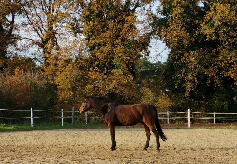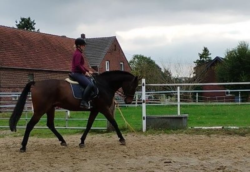 Freundlicher dunkelbrauner Wallach mit sportlicher Abstammung sucht ein neues, liebevolles Zuhause, in dem er seinen Platz als ehrlicher Freizeitpartner finden darf. Bisher wurde er auf Freizeitniveau geritten, war jedoch in den letzten Jahren aufgrund persönlicher Umstände nicht regelmäßig im Training und musste bei mir auch nie besonders viel tun. Er ist also unverbraucht und freut sich schon auf neue Aufgaben. Ich habe ihn selbst gezogen und er hat sein ganzes Leben nur bei mir verbracht. In dieser Zeit war er nie krank. Er wird barhuf gehalten und geritten. Da ich ihm aus beruflichen Gründen zeitlich nicht mehr gerecht werden kann und er sich eine feste Bezugsperson wünscht, die ihn fördert, möchte ich ihn nun schweren Herzens in gute Hände abgeben. Er ist brav im Umgang und zeichnet sich besonders durch sein freundliches und soziales Wesen aus. Aufgrund seiner Größe und der fehlenden Kontinuität unter dem Sattel ist er jedoch für Anfänger als Reitpferd ungeeignet. Er befindet sich zurzeit etwa auf E Niveau, hat aber gutes Potential für mehr. Er besitzt drei ordentliche Grundgangarten, im Springen wurde er bisher nicht gefördert. Er kennt sowohl Boxenhaltung, als auch den Sommer auf der Wiese, fühlt sich jedoch am wohlsten, wenn er am Abend, bei Hitze und besonders bei schlechtem Wetter in seine Box darf. Bei Interesse freuen wir uns über ein persönliches Kennenlernen. Weitere Informationen auf Anfrage.