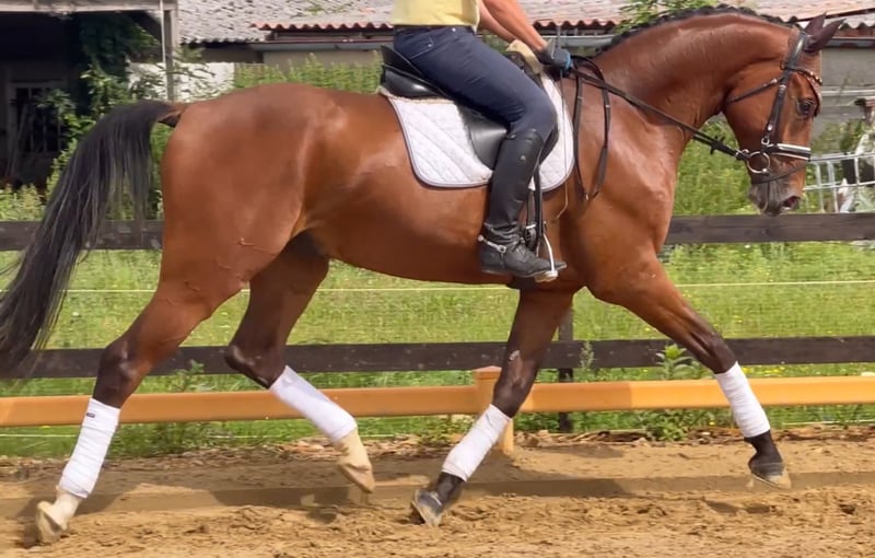 Si Martino is ready to go. A young prospect with many possibilities. He is a loving and talented 5-year-old gelding, bred with a focus on dressage. The affectionate bay impresses with his appearance and pleasant demeanor. At a height of 1.70 m, he is perfect for ambitious riders looking to advance their dressage career. Martino is currently at the Dressage Horse A level and has also placed in his two competitions. His highlights are his friendly and eager-to-learn nature. Martino is ideal for riders seeking a young, developing partner. During his check-up, a small chip was discovered in the hock on the X-ray. This has been removed, and no further issues were found. Everything is perfect and ready to start. After his rehabilitation training, he has now resumed regular versatile work for the past two weeks. If you are looking for a talented dressage horse with many possibilities, then this gelding is just right for you. For more information, feel free to contact me via PM or WhatsApp. One note: Si Martino is not a beginner's horse. Definitely: PvP #priceuponrequest