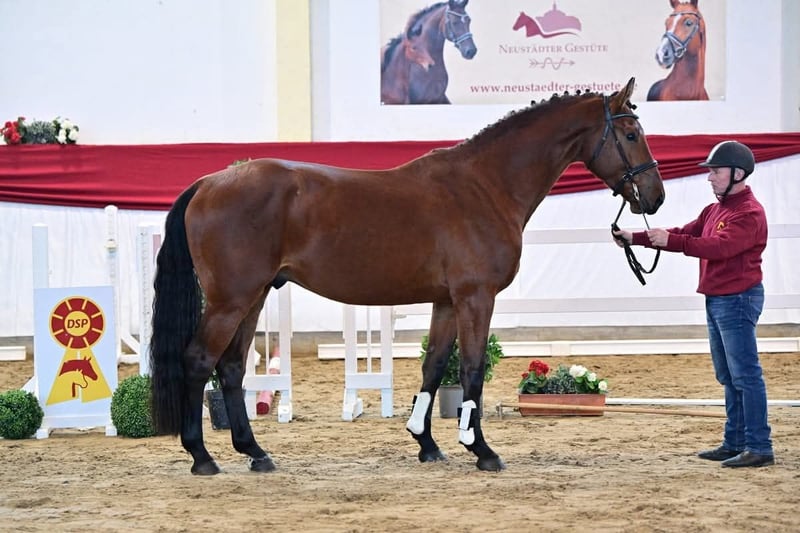 Splendido castrone con ottima attitudine al salto, alla ricerca di mani esperte! In vendita un castrone baio con grande talento per il salto, nato nel 2021. Con un'altezza al garrese di 171 cm, ha la misura perfetta per cavalieri ambiziosi. Ha già ottenuto la qualificazione immediata per il DSP Freispringchampionat 2025 a Lipsia, dove ha dimostrato sicurezza e padronanza del salto, senza lasciarsi intimidire dall'ampia cornice. È dotato di riflessi pronti e grande capacità di valutazione durante il salto. Il suo fratellastro Higgins Red è già vincitore in competizioni internazionali di salto. Il castrone è in ottima salute, con radiografie eccellenti disponibili! Barneby si trova in addestramento di base e ha un carattere amichevole. Per interessati o ulteriori informazioni, sono a disposizione. Visite e prove di salto su appuntamento.