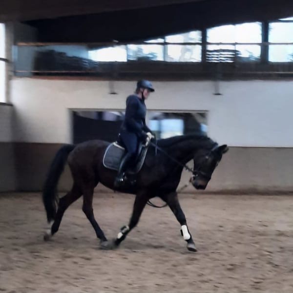 Zum Verkauf steht ein wunderschöner brauner Wallach mit derzeit 166 cm Stockmaß, geboren am 10.05.2020. Das Pferd ist angeritten, eignet sich voraussichtlich aber leider nicht für den Turniersport, da er unter Stress Magenprobleme entwickelt. Unter dem Reiter neigt er zum Steigen und wird deshalb zur Zeit sicherheitshalber mit Stoßzügel geritten. Außerdem zeigt er eine intermittierende Taktunreinheit, die nicht weiter abgeklärt wurde. Er wurde regelmäßig geimpft und entwurmt und ist zahn- sowie huftechnisch bestens versorgt. Im Umgang ist der Wallach brav und sensibel. In der Herde integriert er sich gut und ist sozial. Deshalb hoffen wir, dass er mit ein wenig Zeit und ohne Druck ein gutes Freizeitpferd wird. Als Schulpferd oder an Händler wird er nicht abgegeben. Bei Interesse, weiteren Fragen oder zur Vereinbarung eines Kennenlerntermins melden Sie sich jederzeit gern. Der Sattel kann gegen Aufpreis mit übernommen werden.