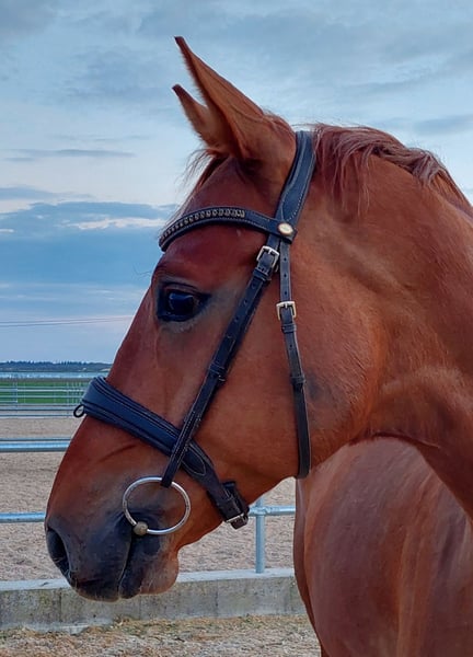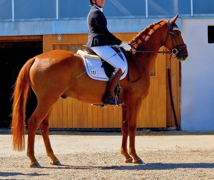 Name: Bossi (Bossa Malandro) Age: 6 years old Color: Dark Chestnut Height: Currently approximately 16.1 hh Training: Bossi has been in my possession since birth. He was backed at four years old and has always been in professional, horse-friendly training (full riding). He currently shows confidence at dressage horse class A level and is on the way to L* (for example, piaffe and passage already very secure). His three evenly good basic gaits (riding horse evaluation: 7.1, dressage horse class A: 7.28) and his lightness, seat comfort, and positive go make him an ideal partner for ambitious riders. With further training, he could also be used in M* level competitions. That was also my plan for him as a young horse. Temperament: In handling, Bossi is well-behaved, calm, and fearless — whether in the arena, on the riding ground, or in the field. Farrier, loading, competition routine, loading or waiting alone in the trailer are no problem for him. Additionally, he has a very people-oriented, affectionate character that brings joy every day. Bossi gets along well with other horses. So far, he shares a paddock with other geldings and is stabled in a box. Health: Bossi is clinically healthy and fully ready for riding and competition use. He has never been lame or seriously ill or injured. An up-to-date health certificate (AKU) with findings (chips: both hind legs left and right, medial and lateral) is available. I insured Bossi at three years old for surgery; this insurance can possibly be transferred. His regular, preventive care (e.g., dental, physiotherapy) is standard for me. Potential Uses: Bossi is versatile: he has potential in dressage, talent for jumping, and relaxed, confident cross-country riding — whether alone or in a group, at the front or behind. His dam, Dornröschen S (state premium mare), is successful in the competition sport: dressage L*/** (multiple wins) and M* placings. She has also competed in show jumping A level. Reason for selling: I am only selling Bossi because my professional circumstances are changing significantly. There is no rush, but I want him to find a home where he will be loved and where his qualities can continue to develop. Price: Reduced due to the findings on the X-ray. The price is negotiable; a suitable home is much more important to me. Getting to know Bossi: A trial ride is possible by appointment.