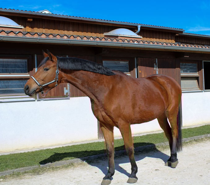 This smart bay is characterized by his smart appearance and very good basic gaits. He is very well-behaved when ridden and always friendly and attentive when handled. He is only now being carefully broken in and is doing very well. He comes directly from the breeder. Further information and pictures / videos on serious request.