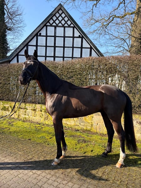 Dieser 7 jährige, elegante und bildschöne Dressur Wallach sucht ein neues 5* Zuhause Der absolut unverbrauchte bildschöne Rapp Wallach wurde im Jahr 2019 geboren und beeindruckt durch sein harmonisches Erscheinungsbild, sowie sein angenehmes Temperament. Mit einem Stockmaß von 172 cm bietet er die perfekte Größe für die anspruchsvollen Reiter, die Wert auf Qualität und Bewegungsfreiheit legen. Sein ausgeprägtes Talent im Dressursport macht ihn zu einem vielversprechenden Partner für die ersten Turniere. Fabergé ist spät angeritten worden und und wurde schonend ausgebildet. Er ist jetzt auf dem Weg zur M-Dressur . Er wurde öffentlich noch nicht gezeigt. Er gibt dem Reiter jederzeit ein angenehmes und sicheres Gefühl und ist fein in der Hand und zeigt sich stets motiviert. Seine Zuverlässigkeit und positive Einstellung machen ihn zu einem tollen Partner. Im Umgang ist er absolut problemlos Bei Interesse oder für weitere Informationen stehe ich gerne zur Verfügung. Besichtigung und Proberitte sind nach Vereinbarung in der Zeit von Montags bis Freitags möglich.