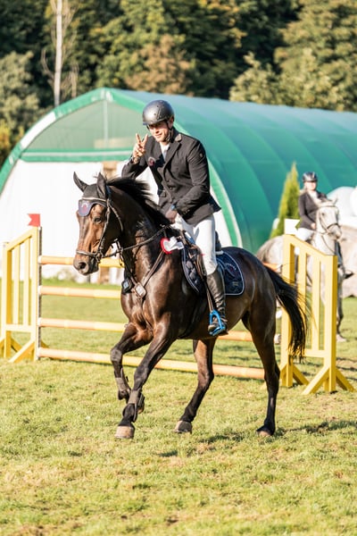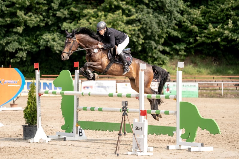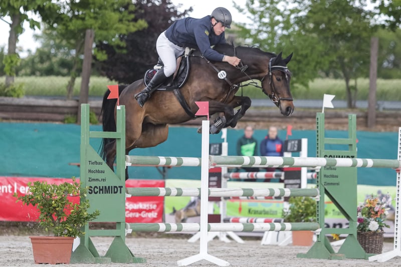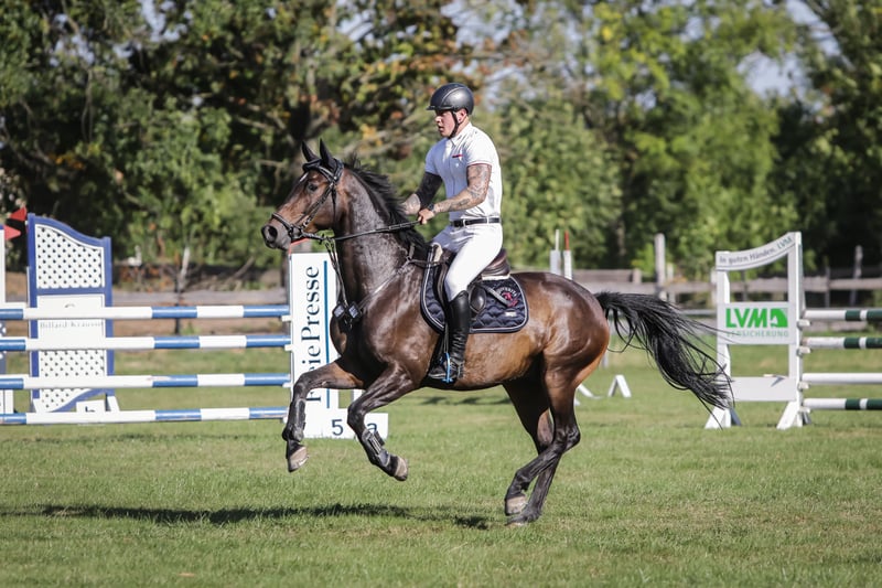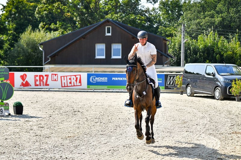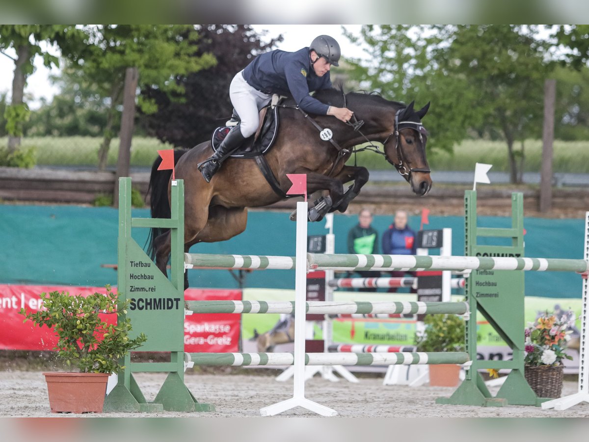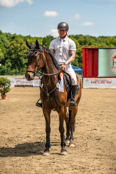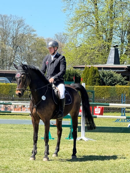 Rondus is an 8-year-old, approximately 16.1 hh bay gelding from a top sport lineage. He has achieved numerous successes and wins in show jumping up to class M, thanks to his talent, heart, and plenty of "GO." He is being sold directly by the breeder and has had no previous owners. Rondus is farrier- and loading-friendly, accustomed to daily turnout in paddock or pasture, and regularly participates in group turnout several times a week. He also freely goes out alone in the terrain, including roads, woods, and lakes. As a 7-year-old, he made a name for himself on the East German show jumping circuit, consistently placing in class M competitions and securing many victories thanks to his natural speed. Rondus has won open jumping classes at 120 cm and 125 cm, was successful in the young horse class with a score of 8.5, and even managed to place in 130 cm classes as a 7-year-old. He has been carefully developed and has never shown any physical issues. A recent, thorough veterinary check with a clean TÜV is available. This is not a desperate sale; the horse will only be sold to a stable where daily turnout in paddock and/or pasture is guaranteed!