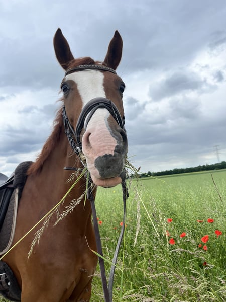 Strahli ist schon mit 1 1/2 Jahren zu mir gekommen, weil ich auf Anhieb schockverliebt war als ich ihn das erste mal gesehen hab! Er besticht nicht nur durch sein schickes Aussehen, sondern auch durch seine sehr kumpelhafte und verschmuste Art. Er beherrscht die M-Lektionen bereits recht sicher und macht auch wirklich einen schönen Sprung. Besonders genießt er auch lange Ausritte durch den Wald. Er ist ein echter Allrounder und dabei immer leichtrittig ☺️ Sehr geeignet auch für Herdenhaltung, da er super verträglich ist und sich mit jedem versteht. Ich gebe ihn wirklich nur sehr schweren Herzens her und wirklich nur in ein liebevolles Zuhause eines ambitionierten Freizeitreiters gerne auch mit Turnierambitionen, aber das sollte nicht im Vordergrund stehen. Mehr hierzu gerne per Telefon.
