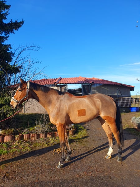 Se ofrece un caballo de gran tamaño, deportivo, muy elegante y bonito. Fue campeón de su camada y destaca, además de por su línea de cría, por su buen carácter. Debido a su tamaño y a su carácter algo tímido, se le dedicó mucho tiempo en su entrenamiento, por lo que entró en el deporte de competición algo más tarde. Ha obtenido hasta dos primeros lugares en concursos de salto A**, y en concursos de salto L ha obtenido buenas notas, hasta 7,9, compitiendo también en grandes recorridos. Es cauteloso y muestra talento para saltar. En el manejo, es un auténtico tesoro: cariñoso, afectuoso y muy cercano a las personas. Al principio puede mostrarse algo reservado con personas desconocidas, pero esto desaparece rápidamente con un trato cariñoso. No tiene malos hábitos en el manejo; es llevado, cepillado y sacado a pastar por niños. Está bien trabajado en doma y ha sido entrenado en la disciplina, y a pesar de su tamaño, es bonito y delicado de montar, con buen paso. Por ello, también lo puedo imaginar en la disciplina de doma o como caballo versátil para ambas disciplinas. A veces puede ser un poco travieso (nada de cabalgar a galope, huir o similares), pero siempre es fácil de manejar, lo cual es natural a su edad. Por eso, sería ideal un jinete o jineta tranquilo, seguro y firme, que le dé confianza en nuevas situaciones y que fomente su progreso en la formación. Conoce la pista cubierta, la pista exterior, la cuerda de entrenamiento, el campo (solo o en compañía), así como el paddock y el pasto en grupo. Es muy sociable y compatible con otros caballos. Por ello, buscamos un hogar donde siga disfrutando de pastar o estar en paddock a diario, preferiblemente con amigos o amigas. No presenta ningún problema con el herrador, ni al viajar en camión. A los 5 años, se le realizó una revisión veterinaria completa sin hallazgos. ¡Se vende solo a las mejores manos!