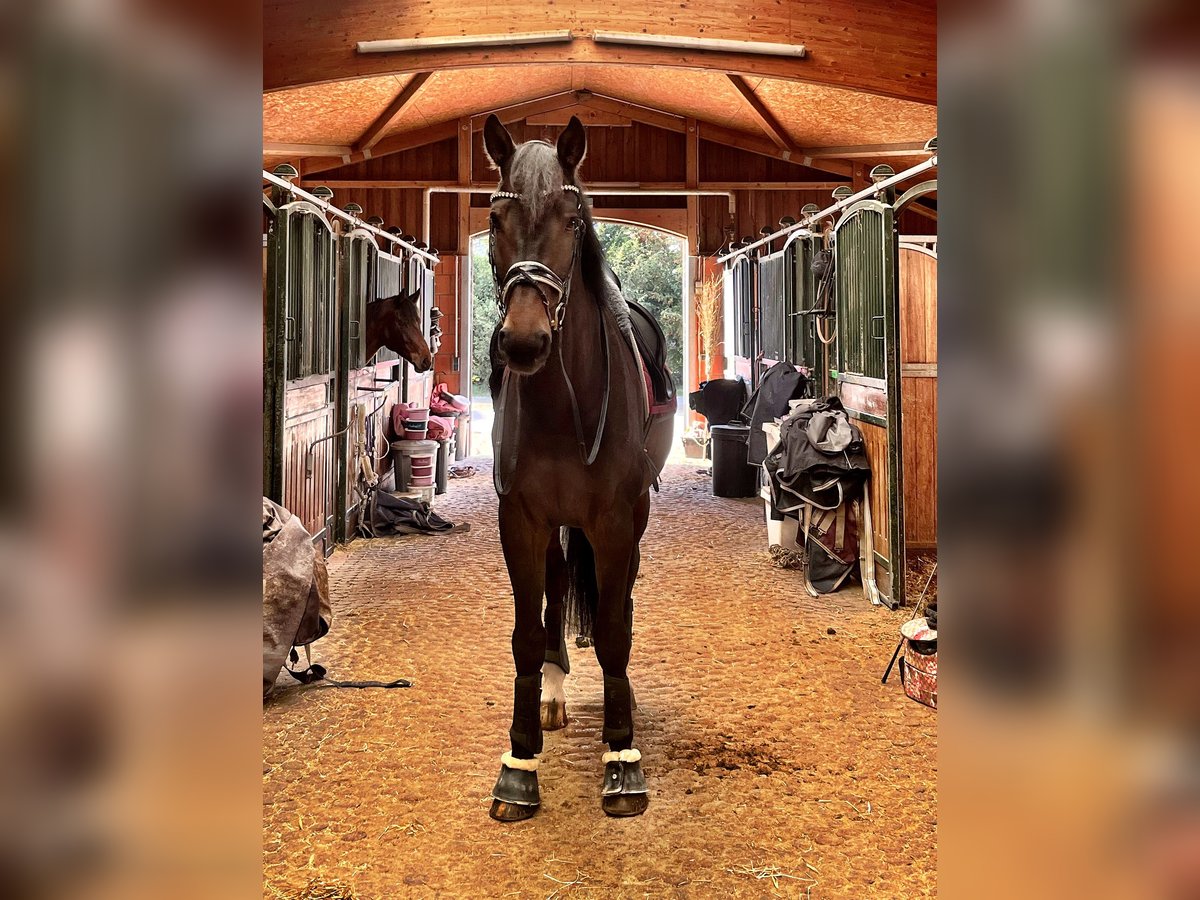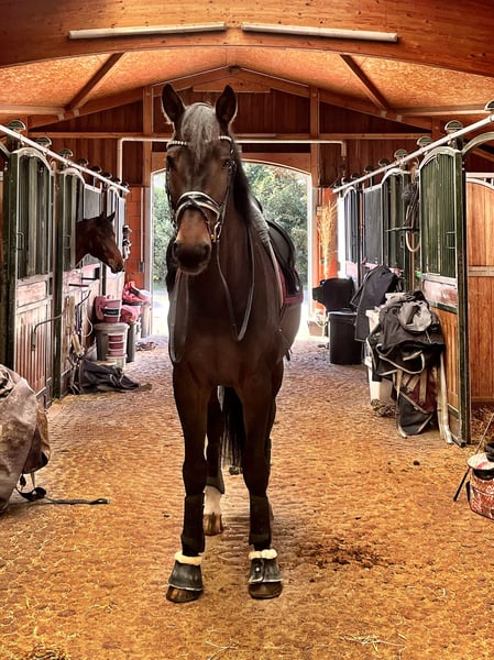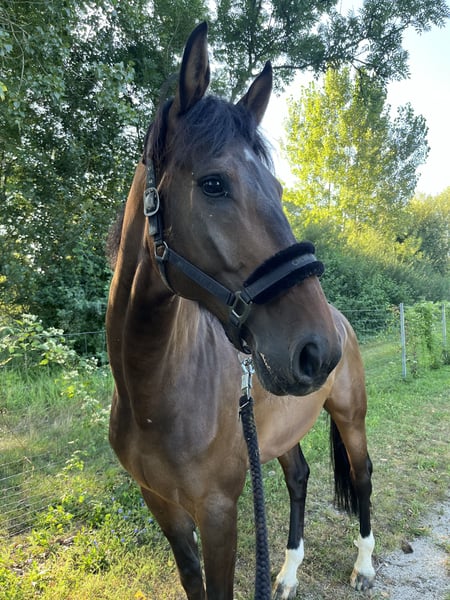 Valentino M is an exceptionally level-headed partner. Whether it's dressage, small jumps, or hacking out—alone or in a group—it’s always a pleasure to ride him. He is familiar with groundwork and fascia training. Has been trained up to A-level dressage but also jumps, including changes and knows how to extend his trot. With a bit of patience, he can be further educated. I have mostly competed him alone, which has always gone smoothly. Currently, he is in a paddock with free turnout, which benefits him greatly given his PSSM2 condition (free of flare-ups for three years now). Thanks to supplements and tailored training, he is easy to manage. Unfortunately, I cannot provide this environment for him in Munich. Therefore, Tino is currently living with my trainer. I wish for him to have a lifestyle like this, with someone who loves him for who he is. He is very affectionate and enjoys human company. He is absolutely shoe and loading-friendly. Currently barefoot. The horse is a kopper.