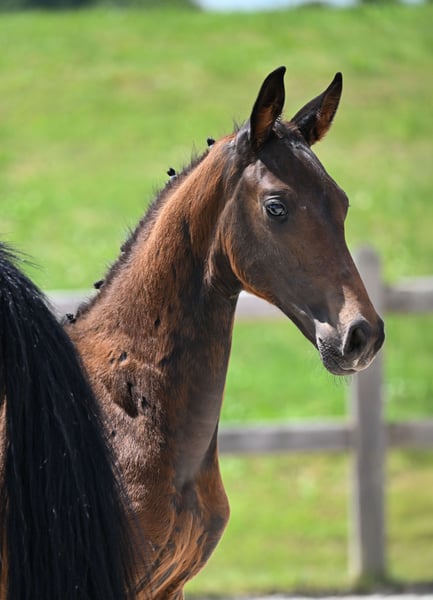 ESCANIRO v. ESCANENO - DE NIRO - LAURIES CRUSADOR XX geboren am 23.3.25 Großrahmig, korrekt, mit drei sehr guten Grundgangarten und vier weißen Söckchen ausgestattet und auch vom Wesen her überzeugend begeistert Escaniro uns jeden Tag. Bei der Fohlenschau Mitte Juni wurde er mit sehr guten Noten prämiert. Der Vater ESCANENO (v. Escamillo - Veneno - Ravallo) aus dem Mutterstamm des Fidertanz war Prämienhengst der westfälischen Hauptkörung. Seine Mutter war Teil der Siegerfamilie der Herwart von der Decken-Schau 2021. Sowohl die Kurz-Veranlagungsprüfung 2022 (Endnote 9,03) als auch den Sporttests 2023 (Endnote 9,05) und 2024 (Endnote 8,97) absolvierte er mit hervorragenden Ergebnissen. 2025 war er bereits mehrfach siegreich in Dressurpferdeprüfungen der Klasse M und ist qualifiziert für das diesjährige Bundeschampionat. Die Mutter DONNA DE NIRO war Siegerstute Dressur auf der Landesschau der zweijährigen DSP-Stuten in Karpfham und wurde mit dem DSP-Prädikat Gesundheit als Prämienstute ausgezeichnet. Der Vollbruder der Mutter lief in Spanien erfolgreich im Dressursport, die erste Tochter der Mutter wurde wie sie selbst als DSP-Prämienstute Gesundheit ausgezeichnet. Aus dem Mutterstamm kommt weiterhin auch der gekörte Hengst Roy Black. Das Fohlen ist im täglichen Umgang mit dem Menschen sehr zugänglich und unkompliziert und wächst in gesunder Umgebung mit viel Weidegang auf. Er wird selbstverständlich regelmäßig dem Hufschmied vorgestellt und entwurmt. WFFS frei. Ab September könnte er in ein neues Zuhause umziehen.