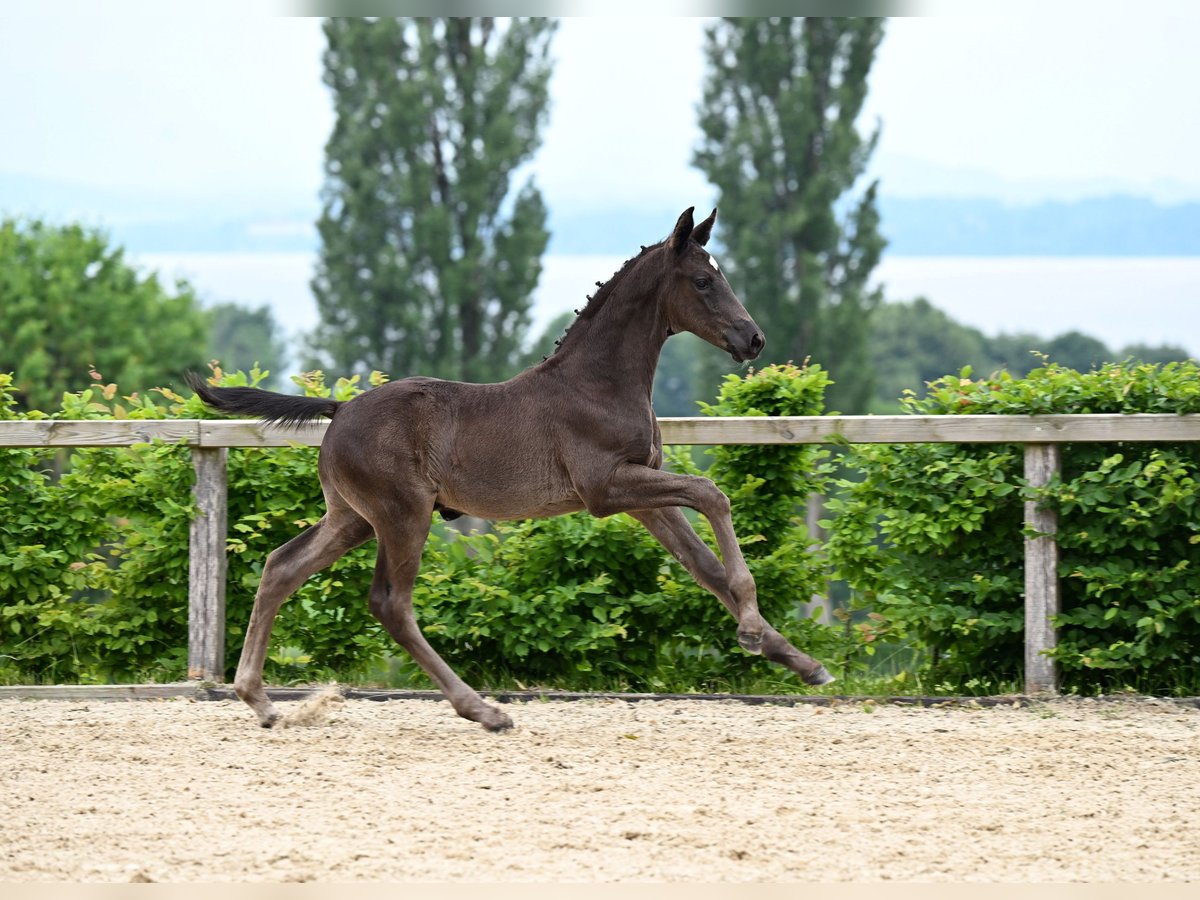 Escanero Del Solei is a very human-oriented, beautifully handsome colt with a dark coat, born in May 2025. He shows great interest in new situations and is absolutely not spooky. He is quick to learn and enjoys practicing the foal ABCs. He is halter-trained, loading well, and he also accepts being sprayed with water and giving his hooves wonderfully. He is accustomed to children, cars, tractors, and dogs. His pedigree is an outstanding dressage mix from internationally successful ancestors. His maternal grandsire is the well-known Danciano, who himself conquered the Grand Prix stage from the line of Escanto PS Old, holding the title of Bundeschampion for 4-year-olds in his bloodline. His sire, Escanto PS Old, stands at 169 cm and has a promising pedigree with Escamillo and Fürstenball in his lineage. The judges awarded a score of 10 at the Bundeschampion for the "very, very expressive trot with good relaxation, clearly light-footed, with an absolutely positive basic tension and completely balanced even in all turns." He also received a 10 for his canter and rideability. Overall, he is a two-time record winner of the stallion performance test. The stallion, born in 2019, has as a sire the renowned Escamillo, who has already won silver and bronze at the Dressage Horse World Championships. Escanero's watchful, curious eyes reflect a high intelligence. His neck is beautifully long with a nicely curved neck arch. Due to his large, sloping shoulder, Escanero Del Solei already exhibits expansive movements, which were rated 8.5 at the foal show. His canter is expressive, with an upward tendency, and he powers from the hindquarters, clearly demonstrated while playing in the pasture. In his trot, he glides rhythmically over the ground, just like his father. His high withers, transitioning into a long back, indicate that the horse can carry its rider and saddle well. Escanero Del Solei's conformation impressed with an elegant foundation, scoring 8 points. His expansive canter was rated 8.5 at just 6 weeks old. His overall impression in behavior and future perspective was rated 9 out of 10. His type was also noted with a very good 9.0. Overall, he achieved a very joyful result of 43.0 points as a premium foal at the foal show on June 16. Currently, he is growing up with a second foal in a herd environment. He will be available for sale no earlier than 6 months. He can be viewed in Munich. We look forward to a personal message.