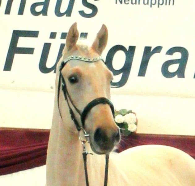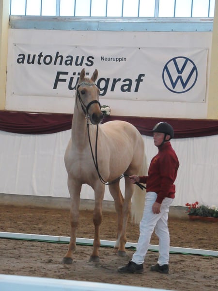 Verkaufe deutsches Sportpferd – Hengst, geb. 2023, Palomino Schon als Fohlen wusste unser Strahlemann zu überzeugen: Gesamtsiegerfohlen auf der Fohlenschau in Kränzlin und Championatsfohlen. Schon damals war der Richter überzeugt: ein Halbblutfohlen von außerordentlicher Qualität! In der begehrten Palomino Farbe und einer Größe von 1,72m ist er ein echter Blickfang. Der Hengst besitzt ein korrektes Fundament und harmonischen Körperbau. Strahlemann F hat sehr gute elastische Grundgangarten und zeigt einen dynamischen Trab mit viel Winkelung in der Vorhand. Im Freispringen zeigt er viel Übersicht und ein enormes Springvermögen. Der Hengst ist gut erzogen und besitzt ein angenehmes Temperament. Seine hervorragende Abstammung und sein ausgeprägtes Bewegungstalent lassen auf eine erfolgreiche sportliche oder züchterische Zukunft hoffen. Strahlemann F wird direkt aus Züchterhand abgegeben. Er ist in einer Gruppe gut betreut auf großen Flächen aufgewachsen. Körfähige Röntgenbilder liegen vor. Bei Interesse freuen wir uns auf Ihre Kontaktaufnahme, um weitere Informationen und einen Besichtigungstermin zu vereinbaren.