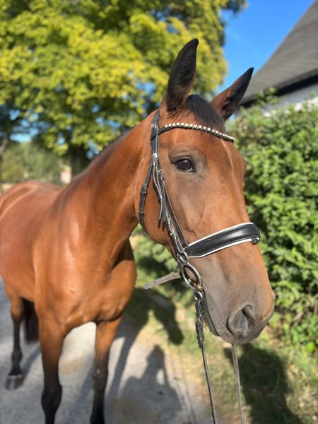 Im Auftrag verkaufe ich eine schicke sehr arbeitswillige Stute. Die 11 jährige Adele wird aus Zeitmangel verkauft, da sie viel Arbeit einfordert. Dabei hat sie manchmal auch ihren eigenen Kopf, wodurch Adele nicht nur von Anfängern geritten werden sollte. Sie ist schmiede- und verladefromm und geht sehr gern ins Gelände. 2023 wurde sie auf einigen Turnieren in Spring- und Geländewettbewerben vorgestellt. Im Springen ist Adele für ein A Springen bereit. Stockmaß: ca. 1.68 Videos und weitere Informationen auf Anfrage. Probereiten möglich. TÜV nicht vorhanden.