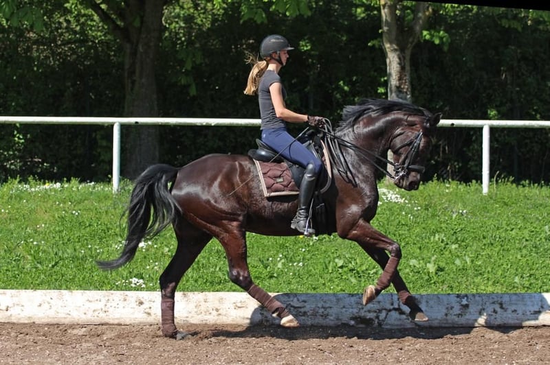 Beautiful Mare Looking for the Perfect Home For sale is a stunning, well-handled 11-year-old dark chestnut mare. She is very calm and friendly in handling, recently even ridden by a 13-year-old girl. Fortunately, she does not display stallion-like behavior around other horses. Under saddle, she has a good amount of energy but has never lost a rider, making her suitable for experienced riders but not for beginners or overly nervous riders. She has been successful in dressage competitions at levels L and L**. She has previously foaled two wonderful foals at ages 4 and 9, including a warmblood-colored foal, making her also interesting for breeders. She has always taken to insemination on the first attempt, had trouble-free foaling, and has been a very caring mother. Since she is somewhat nervous at competitions, I would prefer to rehome her to a leisure rider seeking a high-quality leisure horse for fun. We regularly traveled for training sessions off-site, which was never an issue. She is comfortable riding alone or in a group in the field. She has plenty of go but remains manageable at all times. Last year, Elise underwent a fetlock joint surgery and has since been barefoot and back in training. The surgery revealed no issues. I am happy to provide further details regarding her health upon serious interest. She loves groundwork and greets her handler daily with a nicker. My ideal home for her would be a five-star environment with daily turnout. She is outside all day at my place. She has previously been part of a herd, as well as kept alone, and has adapted well to all situations so far. If you are looking for a motivated, very personable horse for daily riding, Elise could be your dream horse. We look forward to meeting you if you are interested.