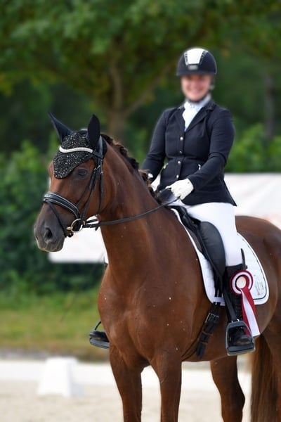 Bella is een indrukwekkende, groot gebouwde DSP-merrie met het hart op de juiste plek. Ze verenigt alles wat je wenst: rijdability, zenuwkracht, werkplezier en een absoluut eerlijk karakter. In de dagelijkse omgang is ze knuffelig, evenwichtig en altijd vriendelijk – gewoon een paard dat ik altijd 100% kon vertrouwen en nooit teleurgesteld werd. Onder het zadel laat Bella zich werkzaam en gemotiveerd zien, altijd bereid om haar ruiter te plezieren. Ik heb haar tot L-niveau geplaats. Ze beheerst M-oefeningen en maakt in de bak een geweldige indruk. Ondanks haar grootte is ze absoluut aangenaam te rijden en geeft ze een geweldig gevoel van veiligheid – een echte levensverzekering die nooit stout is geweest. Ook buitenritten gaat ze rustig aan, waardoor ze niet alleen perfect geschikt is voor ambitieuze ruiters, maar ook voor herintreders, jongeren, angstige ruiters of een moeder-dochter duo met eisen. Wie een eerlijk, expressief en betrouwbaar paard zoekt dat elke dag een geweldig gevoel geeft – of in de dressuurbak of tijdens een ontspannen buitenrit – zal Bella meteen in het hart sluiten. Bella heeft een kleine gezondheidskwestie die is gecontroleerd en die haar in training en recreatief gebruik nog nooit heeft belemmerd, sinds ik haar als veulen heb. Daarom bied ik haar onder de waarde in de allerbeste handen aan, om een liefdevolle plek te vinden – niet vanwege de bevindingen. Locatie: nabij Tuntenhausen (Beieren)