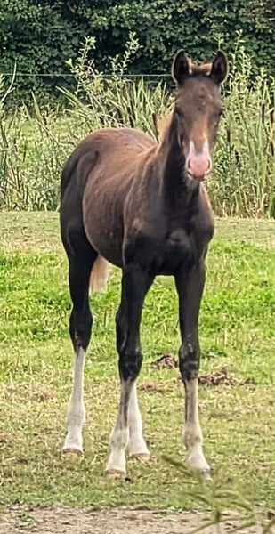 Zum Verkauf steht ein ganz ausgefallen gezeichnetes Stutfohlen von Bonds x Bordeaux. Sie ist mit drei tollen, großzügigen Bewegungen ausgestattet, die auf eine spätere Karriere im großen Viereck hoffen lassen.