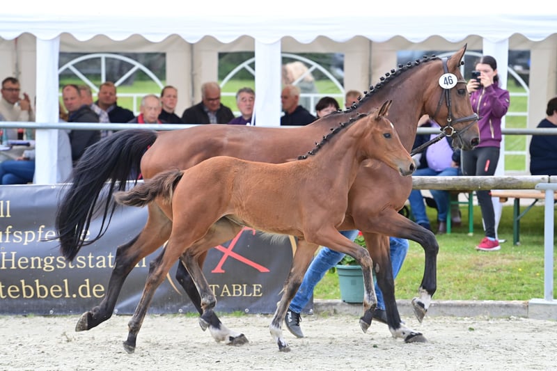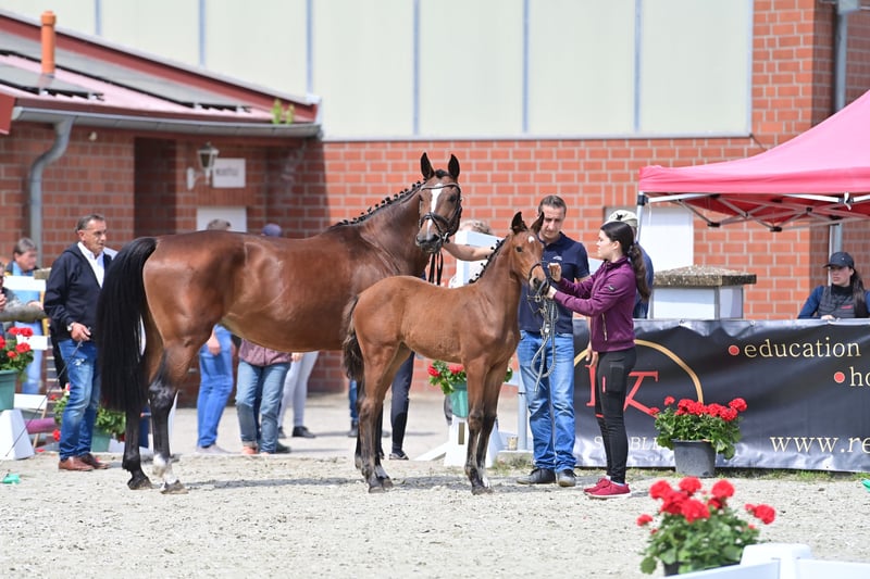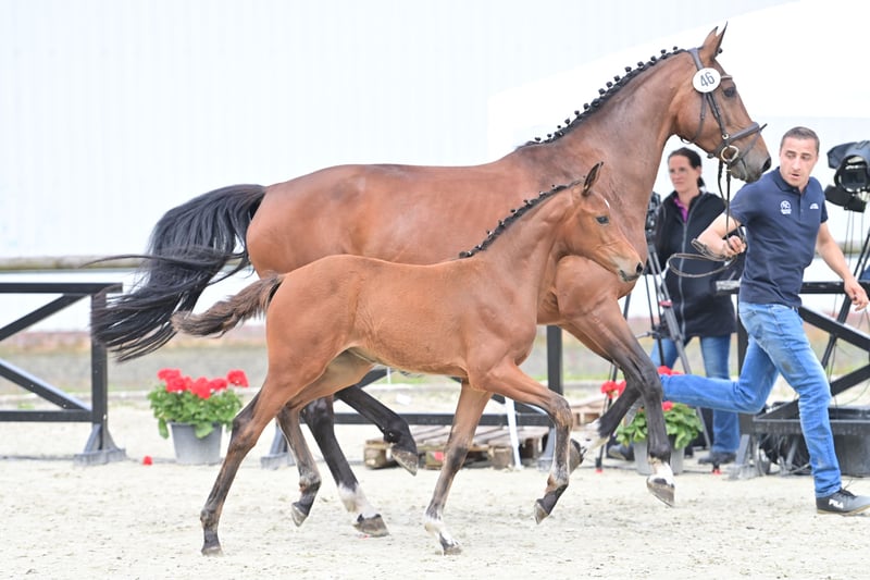 For sale is a promising, high-quality mare from a highly successful dam line, born on 25.03.24. Pedigree: Dia Corrado x Classe VDL x Lupicor This extremely elegant, typey and courageous mare brings a lot of movement quality and ability with remarkable jumping ability. A guarantee and hope for the big tour. In June of this year, she successfully took part in the foal championships and achieved 3rd place against a total of 60 foals with jumping ability and was also awarded a gold premium. Grades: Body: 3x the score 9.0 Movement: 3x the grade 8.5 Overall impression: 3x the grade 9.0 The dam was successful in jumping herself and is characterized by her absolute rideability and abnormal ability at the jump. She passes this on to her offspring through and through:... Her first daughter is internationally successful and placed up to 1.45m. Her 4-year-old son by Codex One is currently being broken in. I also own her 2-year-old black stallion by Cornet de Semilly and a yearling mare, also by Dia Corrado. Dia Corrado is highly successful on the international circuit with Maurice Tebbel and only recently placed in the 3* 1.45 Ranking show jumping competition at the MET in Oliva. We look forward to hearing from you if you are interested and for further information.