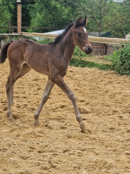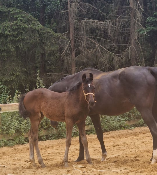 Electra was born with us on 28.04.2024. Her sire is the Oldenburg Verband premium stallion 2024 - Escanto PS. Escamillo - Fürstenball - Totilas Her dam Sunrise Avenue is a Hanoverian mare descended from Sandro Hit - Lauries Crusador xx - Argentinus Electra already has an impressive temperament. She is always attentive and curious. Whether putting on a halter or scratching out hooves, she masters the foal ABC with flying colors. If you would like to get to know Elctra, please contact us. Kind regards