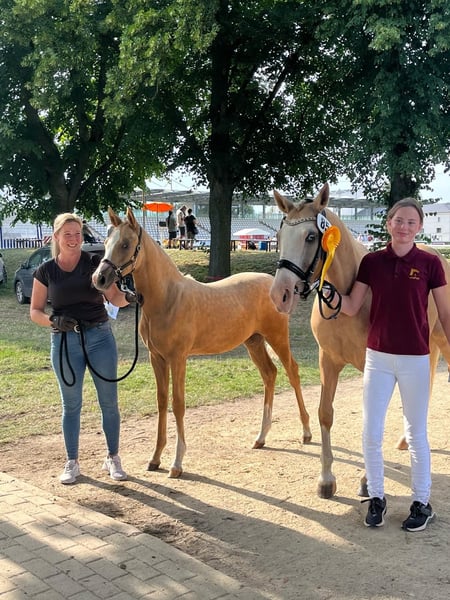 Name Cuba NL Date of birth 23.03.2024 Color Fuchsisabell (Palomino) Sire: Cooper County WE Dam: Charlette StPr Dam's sire: Charmeur Typey Brillantring filly Cuba NL not only impresses with her typey and elegant appearance, but also with very good movements and an impeccable character. Directly from the breeder, born with us and raised in a foal herd with lots of pasture. Regularly wormed, halter trained and farrier friendly. She knows the foal ABC. Her dam "Charlette" (state premium mare) has now brought her third foal in a row to the foal championships in the Brillantring with Cuba NL. Cuba NL leaves nothing to be desired, she has qualities in all directions and is almost certain to reach the final standard. We are only giving her away because her dam is still quite young and already in foal again and her big sister (S: Numero Uno) is already waiting in the wings. Dam and siblings can also be viewed. She could also stay with us for foal rearing if required.