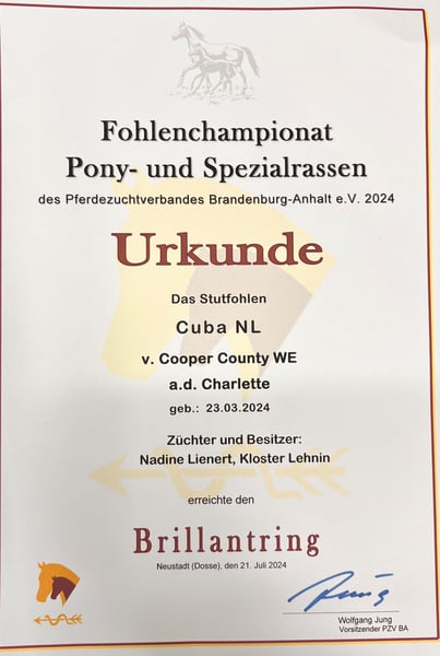 Naam Cuba NL Geboortedatum 23.03.2024 Kleur Vosisabel (Palomino) Vader: Cooper County WE Moeder: Charlette StPr Moeder vader: Charmeur Typvol Brillantring-veulen Cuba NL onderscheidt zich niet alleen door haar typvolle en elegante verschijning, maar ook door zeer goede bewegingen en een onberispelijk karakter. Direct van de fokker, bij ons geboren en tot nu toe opgegroeid in een veulenkudde met veel weidegang. Regelmatig ontwormd, halster gewend en hoefsmidvriendelijk. Het veulen ABC zit goed. Haar moeder "Charlette" (Staatsprämienstute) heeft met Cuba NL nu al het derde veulen op rij naar het veulenkampioenschap in de Brillantring gebracht. Cuba NL laat niets te wensen over, ze heeft kwaliteiten in alle richtingen en zal zeer waarschijnlijk haar eindmaat bereiken. We geven haar alleen weg omdat haar moeder nog vrij jong is en al opnieuw drachtig is, en haar grote zus (V: Numero Uno) al in de startblokken staat. Moeder en broers/zussen kunnen bekeken worden. Voor de veulenopfok kan ze ook bij ons blijven als dat nodig is.