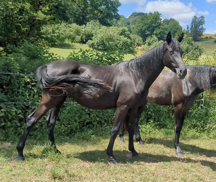 We are offering a stylish, jet-black mare from our own breeding. She is a refined, well-built horse with a correct conformation. In handling, she is a real sweetheart: halter-trained, easy to touch all over, willing to give her hooves, calm with the farrier, and has never been ill. She has three very good gaits, making her suitable for a successful career in the dressage arena. Currently, she is turned out 24/7 in a mixed-age mare herd on pasture. During winter, she shared the herd’s open stable with 24-hour access to turnout. Further details gladly provided via WhatsApp or phone!