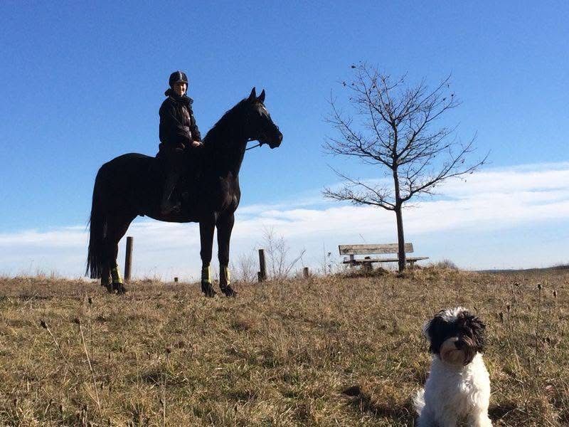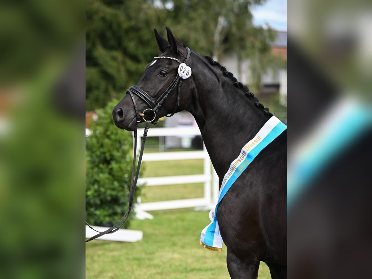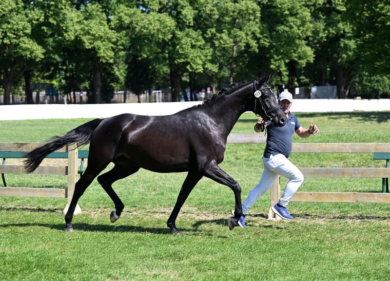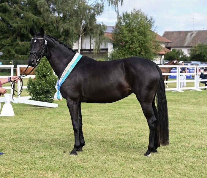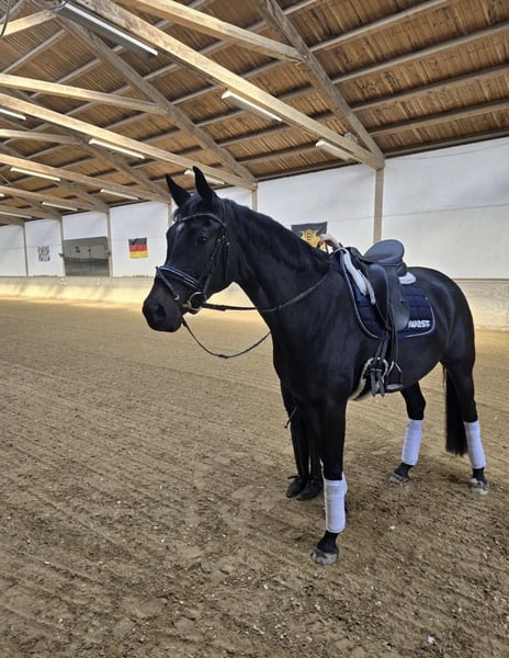 Zum Verkauf steht eine bildhübsche 4-jährige Rappstute, die nicht nur durch ihr edles Erscheinungsbild, sondern auch durch ihren tollen Charakter überzeugt. Sie wurde schonend angeritten und zeigt sich dabei stets unerschrocken, neugierig und lernwillig. Für ihr junges Alter ist sie bereits sehr schön ausbalanciert und verfügt über drei gute, sehr taktmäßige Grundgangarten. Aktuell befindet sie sich auf dem Ausbildungsstand Dressurpferde A und meistert diese Aufgaben sicher. Im Umgang ist sie absolut unkompliziert und angenehm, sodass sie auch für schwächere oder weniger erfahrene Reiter bestens geeignet ist. Ein echtes Traumpferd mit tollem Auge und viel Ausstrahlung – wie gemalt! Guter TÜV vorhanden