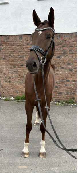 Bella Luna wurde Mitte des Jahres bei uns eingeritten und schonend ausgebildet. Sie geht alleine und in der Gruppe ins Gelände und springt einen kleinen Parcours. Verladen und Auswärtstraining kennt sie ebenfalls. Sie ist sehr schön und hat 3 tolle Grundgangarten. Bluna ist überhaupt nicht guckig oder schreckhaft und nie grell. Auch wenn sie mal einen Tag nicht gearbeitet wurde kann man mit ihr ohne abzulongieren ins Gelände reiten. Beim Springen will sie immer auf die andere Seite und würde sich gut als Hunter eignen. In der dressurmäßigen Arbeit kann sie ihren eigenen Kopf haben, wenn sie etwas nicht möchte, daher braucht sie einen erfahrenen, sicheren Reiter. Gute Röntgenbilder liegen vor! Huntervideo gerne anfragen unter 015140434875