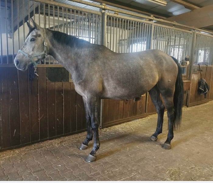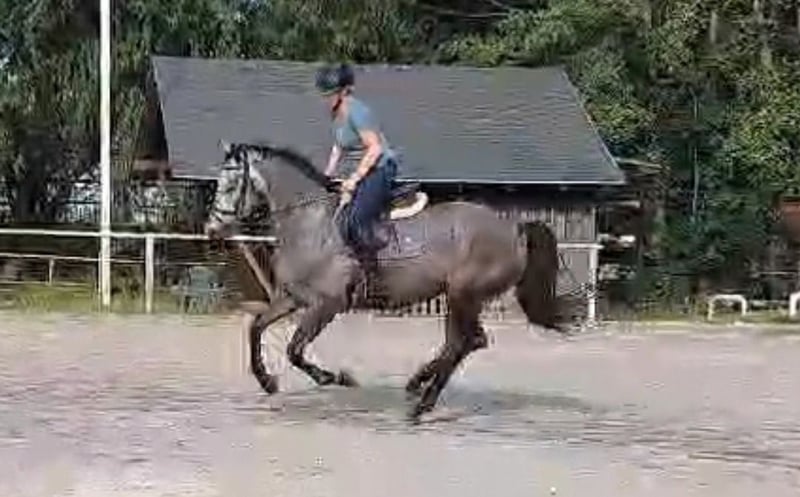 Ich verkaufe hier aus eigener Zucht meine hübsche und kopfklare Stute Dakota. Ich habe sie letztes Jahr angeritten, dann pausierte sie aufgrund meiner Schwangerschaft und ist dieses Jahr seit April wieder regelmäßig (ca. 3x die Woche) unterm Sattel. Dakota lernt sehr schnell und ist absolut lieb (kein buckeln, kein Steigen etc.). Sie springt sicher einen E Parcour, landet dabei stets auf der richtigen Hand und beherrscht fliegende Galoppwechsel. Auch wurde sie bereits auf einem kleinen Turnier vorgestellt, was sie tadellos machte. Sowohl auf dem Hängerplatz als auch auf dem Abreiteplatz und im Parcour zeigte sie sich abgeklärt, ruhig und leistungsbereit. Zuhause wird sie natürlich auch dressurmaßig gefördert, was dem Reiter durch ihre gute Rittigkeit nicht schwer fällt und geht regelmäßig ins Gelände. Sie ist schmiedefromm und kennt sowohl allein als auch zu zweit Hänger fahren. Auch steht sie zur Abwechslung auch mal auf dem Laufband. Ich kann mir Dakota ideal als Familien, Jugend-/ Kinderpferd oder gehobenes Freizeitpferd mit Turnierambitionen vorstellen. Aufgrund ihrer sehr guten Abstammung natürlich auch für die Zucht interessant, V:Cosido/MV:Colorit und MMV: Gingerino waren alle bis zur Klasse S erfolgreich. Sie war nie krank, ist geimpft und entwurmt und es wurden anfang des Jahres Zähne gemacht. Nur in beste Hände zu verkaufen. 015738782875