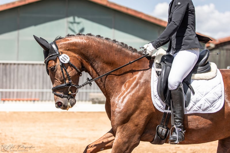 For sale: Elegant dark chestnut mare – German sport horse We are offering a beautiful German sport horse mare, born in 2020. Standing at an impressive 16.1 hh, she combines strength, elegance, and expressiveness. Our homebred mare, Tonia BL, is available – an exceptionally talented and striking young mare with great potential for upper-level dressage. Descended from Fürst Nymphenburg x Topas (son of the legendary Totilas), she embodies excellent rideability, a balanced temperament, and three above-average basic gaits in a modern, athletic type. This elegant chestnut mare impresses with lightness of movement, eagerness to learn, and expressiveness. Tonia has successfully competed in dressage horse tests of class A and, in her first L-level dressage young horse test—without extensive specific preparation—achieved an outstanding score of 7.22. She consistently shows motivation and focus during training. She already masters flying changes, shoulder-in, and volte exercises confidently, and traversals in trot and canter come easily to her. But Tonia is not only at home in the dressage arena: She demonstrates talent and awareness over fences, combined with a quick, alert front leg and a lot of enthusiasm for work. During a basic jumping test, she performed confidently and with great composure—truly a versatile partner for any rider. In daily handling, Tonia is straightforward, well-behaved, and very people-oriented. She is easy to ride, honest in character, and well-suited for ambitious amateur riders. Another highlight: Tonia has already foaled a healthy, typey foal—a further testament to her quality, also as a future broodmare. A mare that impresses in every way—for riders seeking lightness, potential, and charm in one horse. 📍 Location: Ausbildungsstall Berner-Leis, Aurach (Middle Franconia) 📞 Videos & more information: 0155 6014 9005