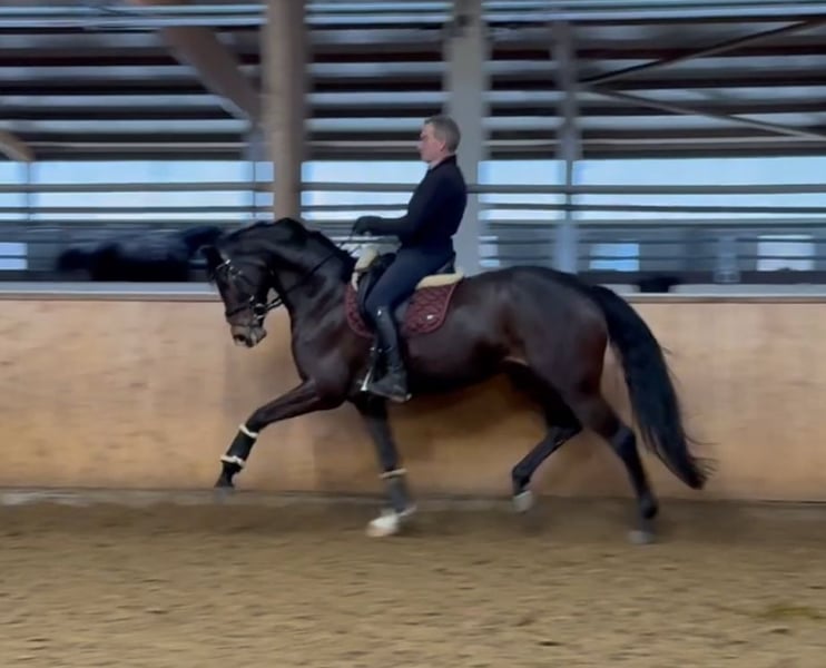 Jovina comes from our own breeding, has grown up with us, and has been carefully trained. At four years old, she was backed and is now, at five, already placed in A and L dressage competitions. She impresses with a very active, powerful hind leg, a lot of expression in her movement, and a high willingness to collect. Riding qualities: • easy to ride and comfortable to sit on • much go, always eager and willing to work • always uncomplicated and pleasant in the hand Character: friendly, motivated, and therefore ideal for ambitious riders looking for a talented young horse. Jovina combines willingness to perform, rideability, and beauty – a mare with great potential for advanced dressage sport. X-rays are available at four years old with no findings.