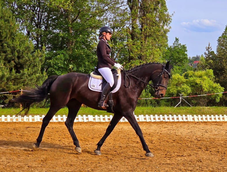 Na sprzedaż wystawiona jest klacz sportowa urodzona w 2019 roku. Ma jednostronną paraliż krtani, co powoduje charakterystyczny świst podczas oddychania. Dodatkowo cierpi na lekką astmę. Obie dolegliwości nie sprawiają jej większych problemów i nie wymaga leków. W tym roku startowała na konkursach do klasy L. Zauważyłam jednak, że intensywny trening jest dla niej zbyt obciążający. Szukam dla niej rekreacyjnego jeźdźca, który chętnie jeździ na teren i jednocześnie poszukuje konia do jazdy w zakresie rekreacji i dressage w stopniu A/L. Jest to dobrze wykształcona klacz, która sprawia dużo radości. Ma również wspaniały charakter i mimo młodego wieku zachowuje spokój. Obecnie jest pod kopytem przednim i stoi w mieszanej grupie, spędzając dzień na pastwisku, a noc w boksie. Z innymi końmi dogaduje się bez problemu. Po lekkim namowieniu chętnie się załadowuje, a podczas czyszczenia jest spokojna i posłuszna. Posiada dopasowany do niej uprząż do jazdy w stylu dressage, którą można również dokupić.