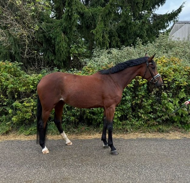Cette jument Topas expressive recherche un nouveau foyer où elle pourra briller. « Lizzy » est en notre possession depuis décembre 2024 et a été doucement formée au niveau A durant l'été. Nous avons commencé à travailler avec elle en petites séances de saut L. Lizzy connaît le travail avec des barres au sol et des cavaletti, et elle avance courageusement en terrain. Pour des raisons de temps, elle n’a pas encore participé à des concours cette année, mais elle est déjà inscrite à la Fédération Équestre Nationale (FN) et pourrait débuter immédiatement. Lors des entraînements en extérieur, elle s’est toujours montrée très détendue et sans peur. Elle est enregistrée dans le livre d’élevage du Verband Baden-Württemberg du sport équestre. Elle possède un caractère très agréable et cherche toujours à plaire à son humain. Elle adore être brossée et câlinée. Chez nous, Lizzy passe la journée dans un petit troupeau de juments sur le paddock ou en pâture, et la nuit dans son propre box. Nous souhaitons lui offrir un foyer où elle sera encouragée et où elle recevra toute l’attention de son propriétaire. Lizzy est entièrement vaccinée, a toujours été vermifugée régulièrement (de manière sélective) et voyage très calmement en van. De bonnes radiographies sont disponibles. En raison de sa taille et de son âge, elle n’est pas encore adaptée aux enfants, et les débutants ou les reprises doivent être accompagnés d’un entraîneur ou d’un préparateur. Pour une rencontre avec une séance d’essai, une participation de 25 euros en espèces est exigée immédiatement.