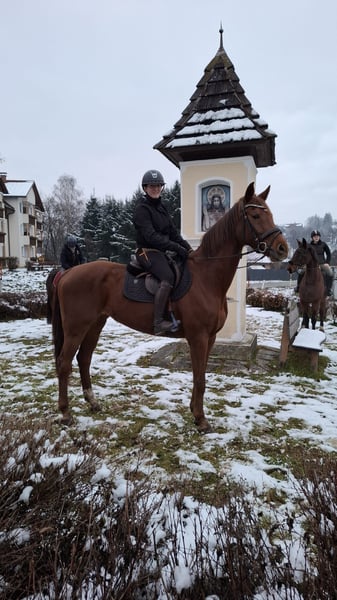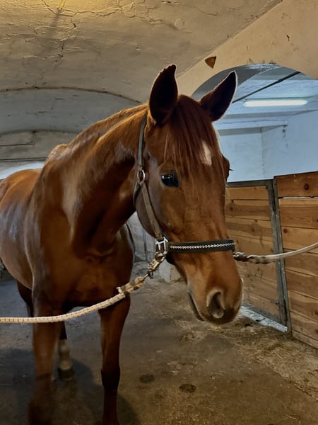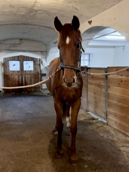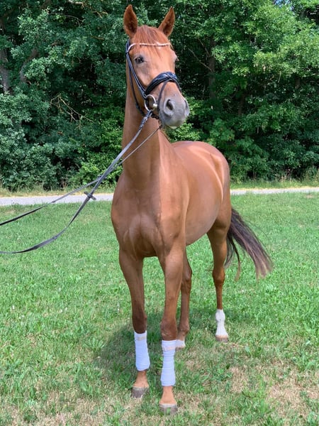 Athletic, Sensitive Chestnut Mare with Potential for Advanced Sport For sale is a stunning chestnut mare, a German sport horse, approximately 16.1 hands high. She will turn seven years old on March 19, 2026. The mare is lightly backed; however, she has only been under saddle for a few months and is therefore sold as a raw, untrained horse. During this time, she has shown a strong willingness to learn and impressive movement. She has been worked in dressage but also demonstrates a lot of motivation and talent in jumping – she is not a stopper and impresses with a very good work attitude. She is also experienced in the terrain, calmly goes through water, and has been regularly ridden out on hacks. In character, she is sensitive, intelligent, and somewhat demanding. She requires an experienced, consistent, and patient handler who can provide her with security and further her development. In daily handling, she can be somewhat challenging – especially at the trailer, farrier, and veterinarian, where she can be demanding and needs a calm, confident rider or handler. I am offering her solely due to lack of time, as my professional and private commitments prevent me from giving her the training she deserves. With proper support, she has great potential for high-level competition and will undoubtedly bring much joy to a professional or ambitious rider. However, she is not suitable for beginners, hobby riders, children, or as a family horse.