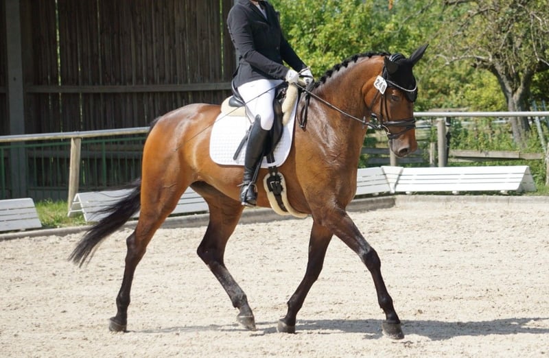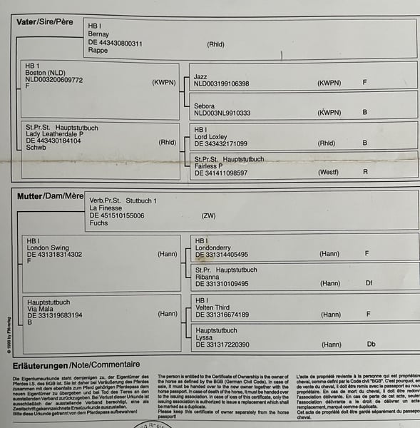 Se ofrece una yegua de carácter distintivo y expresión notable, nacida el 30 de abril de 2019, por Bernay x London Swing. Rendimiento y calidad: La yegua aprobó con éxito su prueba de rendimiento para yeguas y finalizó con una nota global de 7,37 (Danza 7,8 / Saltos 6,8). En la evaluación de su manejo, fue calificada con una excelente puntuación de 9,0. Está clasificada en concursos de doma clásica en la categoría A y destaca por sus excelentes movimientos básicos. Se dispone de un informe de salud sin defectos, incluyendo radiografías de columna y columna cervical. Información sobre su estado de salud: Debido a una enfermedad neurológica, actualmente no puede ser trabajada bajo el jinete. Por ello, se vende exclusivamente como yegua de cría. Paseos y galopes en paso son posibles sin problema. Para más información sobre el diagnóstico, no dudes en contactarme personalmente. Carácter y manejo: En el manejo diario, la yegua es una verdadera joya, muy fácil de tratar: tranquila en la herrería, con el veterinario y al cargar en el remolque. Puede ser manejada y cepillada sin dificultad por niños. No presenta comportamientos indeseados como cabeceo o balanceo. Cría: La yegua entra en celo regularmente y puede ser inseminada de inmediato. Gracias a su linaje, resultados de la prueba de rendimiento y su conformación convincente, posee excelentes condiciones para la cría. Precio a consultar. Para interés serio, agradecería un mensaje.
