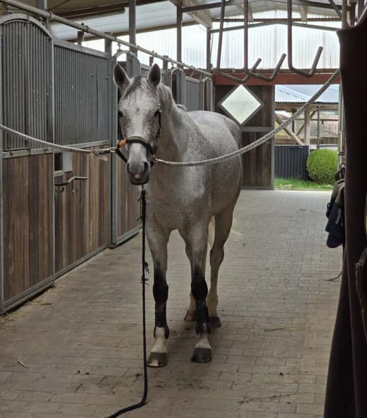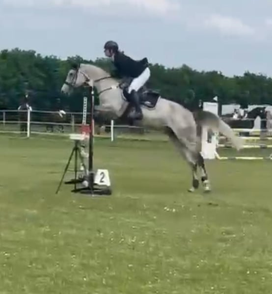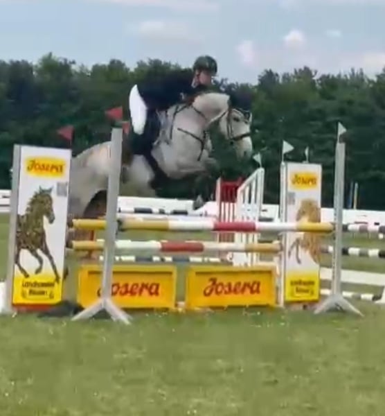 Biete hier im Auftrag eine 7 jährige, erfolgreiche Deutsche Sportpferdstute von Diplon x Color Fox an. Auf Turnier eingetragen als “Chaos Queen”, ist 170cm groß und vorne beschlagen. Sie ist mit Amateur auf Turnier im L Springen platziert wurden und hat sich mit einem Kind auf E platzieren können. Außerdem hat sie als Staatsprämienstute Noten von 9,0 erhalten. Verladen lässt sie sich Problemlos. Röntgenbilder sind vorhanden. Videos können gesendet werden.